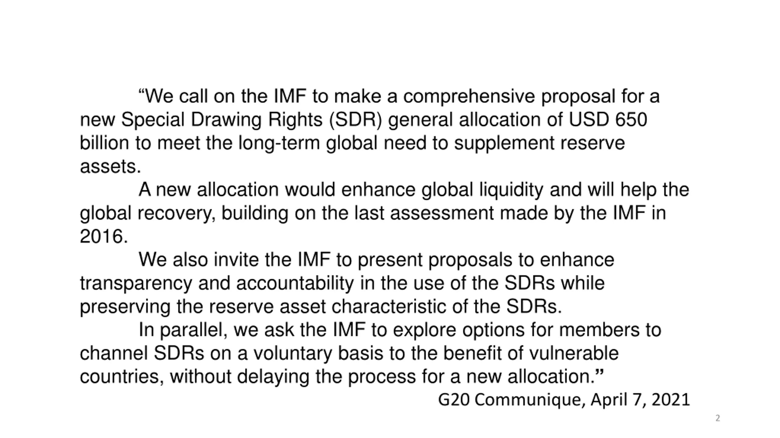 We call on the IMF to make a comprehensive proposal for a new Special Drawing Rights (SDR) general allocation of USD 650 billion to meet the long-term global need to supplement reserve assets. A new allocation would enhance global liquidity and will help the global recovery, building on the last assessment made by the IMF in 2016. We also invite the IMF to present proposals to enhance transparency and accountability in the use of the SDRs while preserving the reserve asset characteristic of the SDRs. In parallel, we ask the IMF to explore options for members to channel SDRs on a voluntary basis to the benefit of vulnerable countries, without delaying the process for a new allocation. G20 Communique, April 7, 2021 2