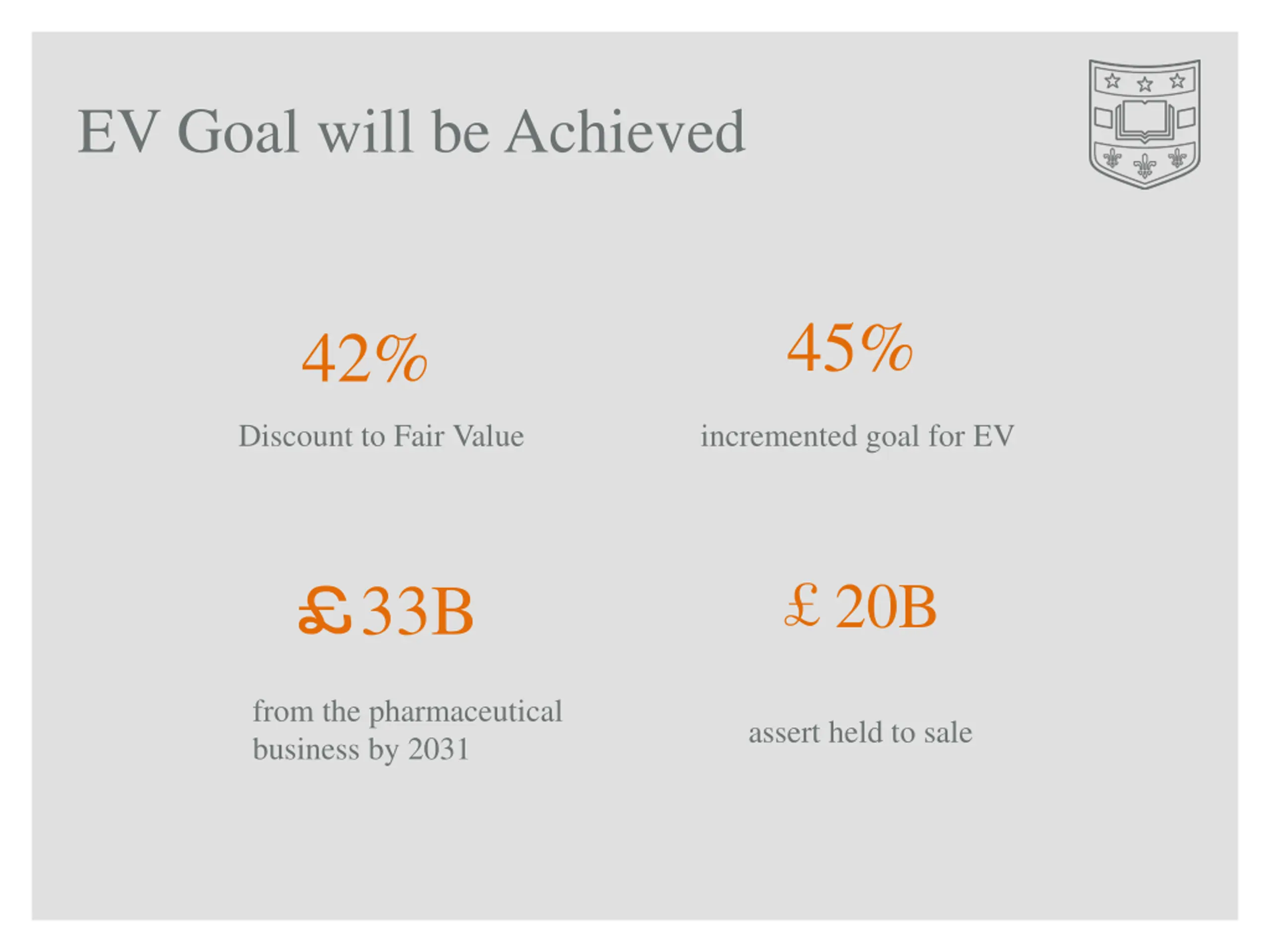 EV Goal will be Achieved 45% 42% Discount to Fair Value incremented goal for EV 20B 33B from the pharmaceutical business by 2031 assert held to sale