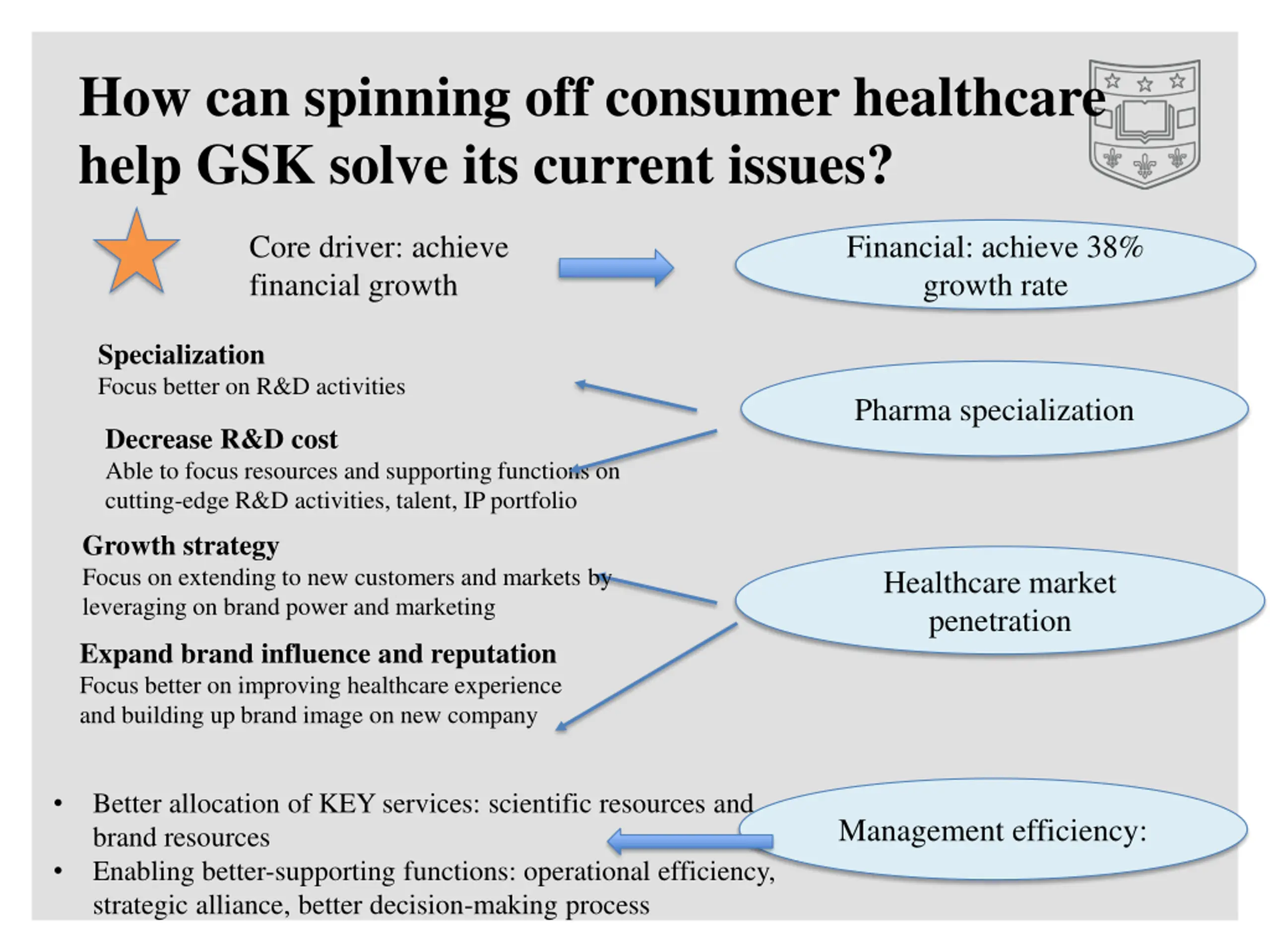 How can spinning off consumer healthcare help GSK solve its current issues? Core driver: achieve financial growth Financial: achieve 38% growth rate Specialization Focus better on R&D activities Pharma specialization Decrease R&D cost Able to focus resources and supporting functions on cutting-edge R&D activities, talent, IP portfolio Growth strategy Focus on extending to new customers and markets by leveraging on brand power and marketing Healthcare market penetration Expand brand influence and reputation Focus better on improving healthcare experience and building up brand image on new company Better allocation of KEY services: scientific resources and brand resources Enabling better-supporting functions: operational efficiency, strategic alliance, better decision-making process Management efficiency: