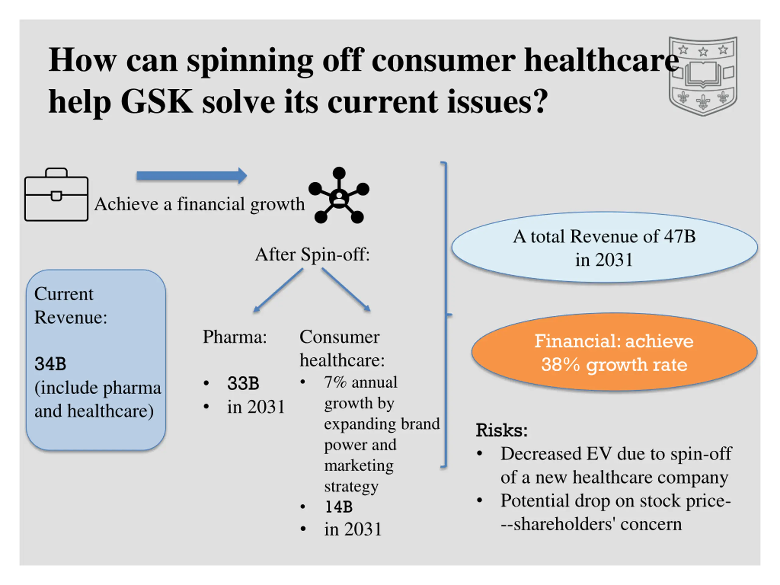 How can spinning off consumer healthcare help GSK solve its current issues? Achieve a financial growth A total Revenue of 47B in 2031 After Spin-off: Current Revenue: Pharma: Consumer healthcare: 7% annual growth by expanding brand power and marketing strategy 14B in 2031 Financial: achieve 38% growth rate 34B (include pharma and healthcare) 33B in 2031 Risks: Decreased EV due to spin-off of a new healthcare company Potential drop on stock price- --shareholders' concern