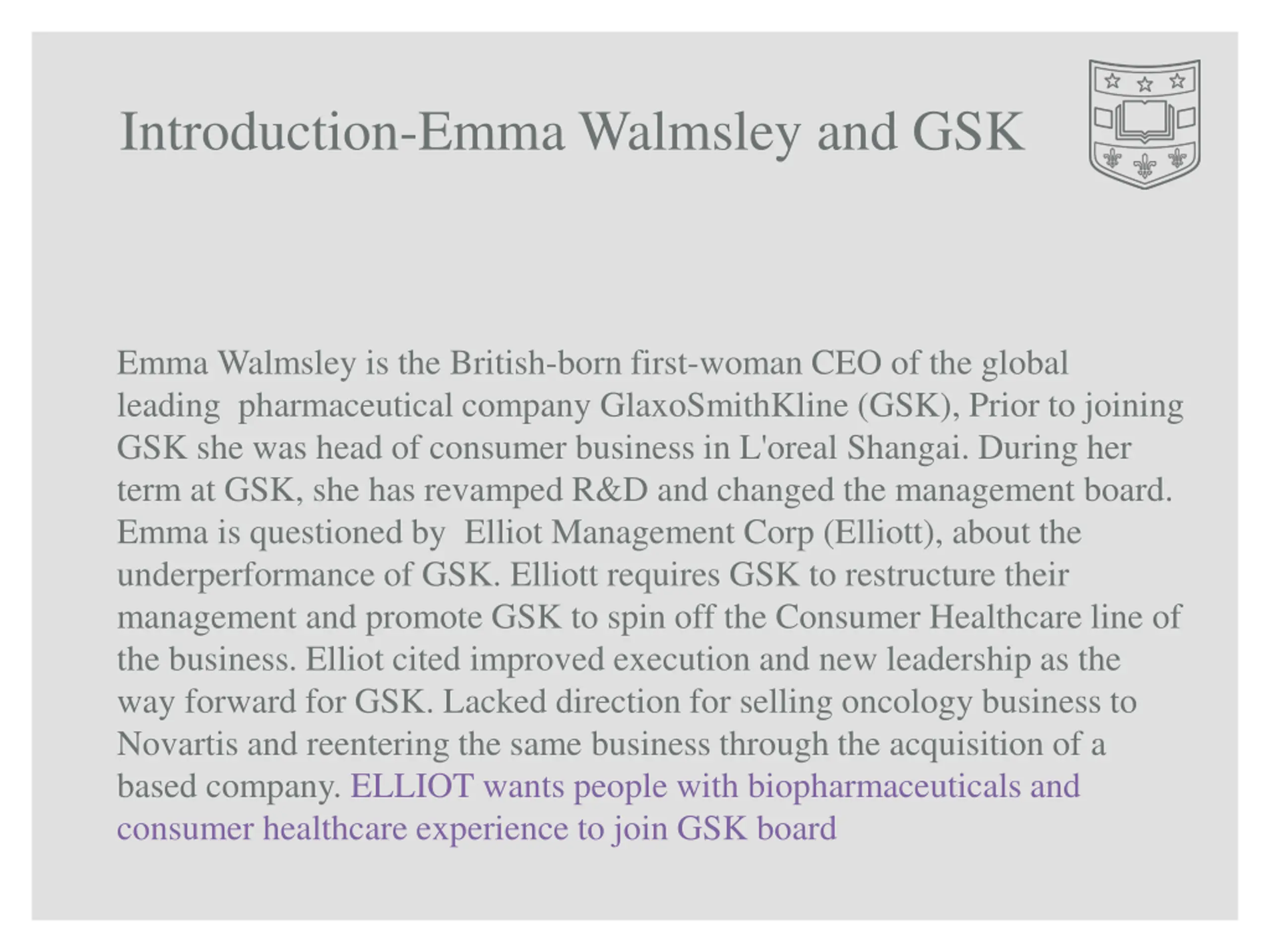 Introduction-Emma Walmsley and GSK Emma Walmsley is the British-born first-woman CEO of the global leading pharmaceutical company GlaxoSmithKline (GSK), Prior to joining GSK she was head of consumer business in L'oreal Shangai. During her term at GSK, she has revamped R&D and changed the management board. Emma is questioned by Elliot Management Corp (Elliott), about the underperformance of GSK. Elliott requires GSK to restructure their management and promote GSK to spin off the Consumer Healthcare line of the business. Elliot cited improved execution and new leadership as the way forward for GSK. Lacked direction for selling oncology business to Novartis and reentering the same business through the acquisition of a based company. ELLIOT wants people with biopharmaceuticals and consumer healthcare experience to join GSK board