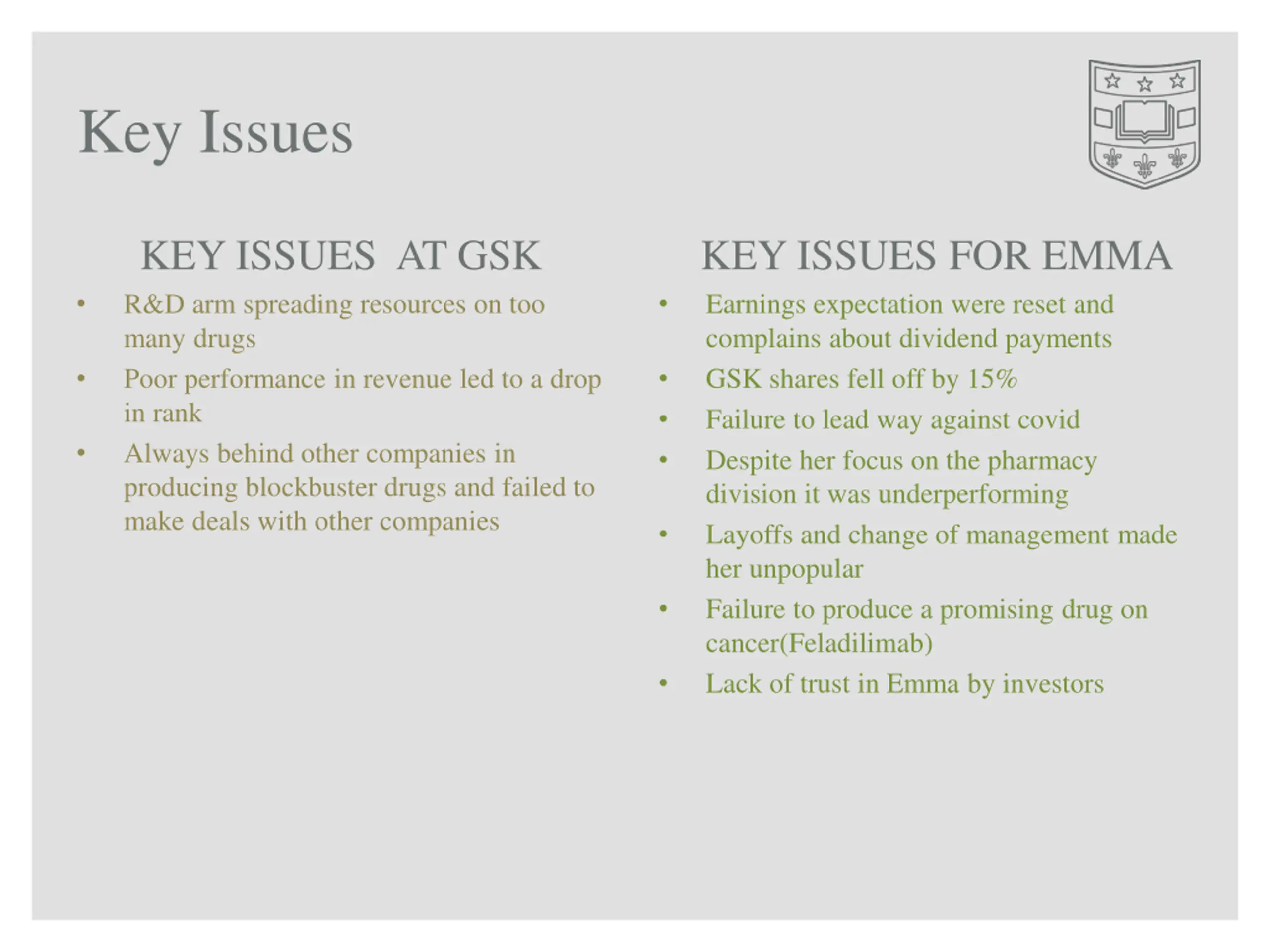 Key Issues KEY ISSUES AT GSK R&D arm spreading resources on too many drugs Poor performance in revenue led to a drop in rank Always behind other companies in producing blockbuster drugs and failed to make deals with other companies KEY ISSUES FOR EMMA Earnings expectation were reset and complains about dividend payments GSK shares fell off by 15% Failure to lead way against covid Despite her focus on the pharmacy division it was underperforming Layoffs and change of management made her unpopular Failure to produce a promising drug on cancer(Feladilimab) Lack of trust in Emma by investors