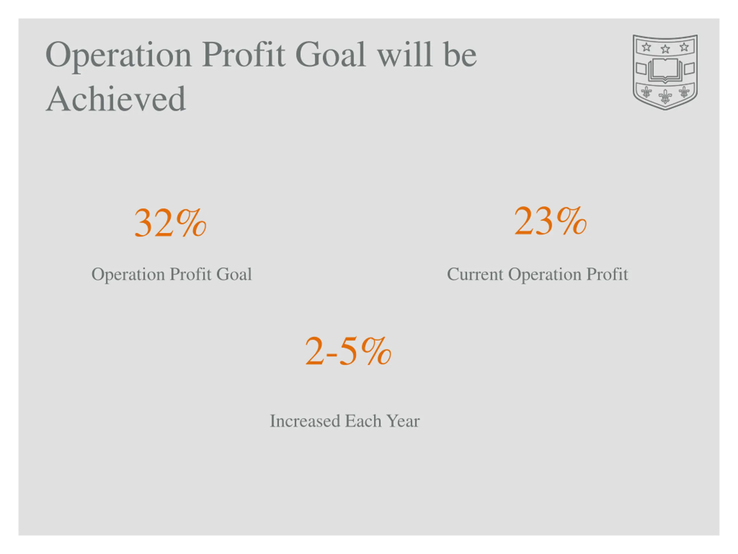 Operation Profit Goal will be Achieved 23% 32% Operation Profit Goal Current Operation Profit 2-5% Increased Each Year