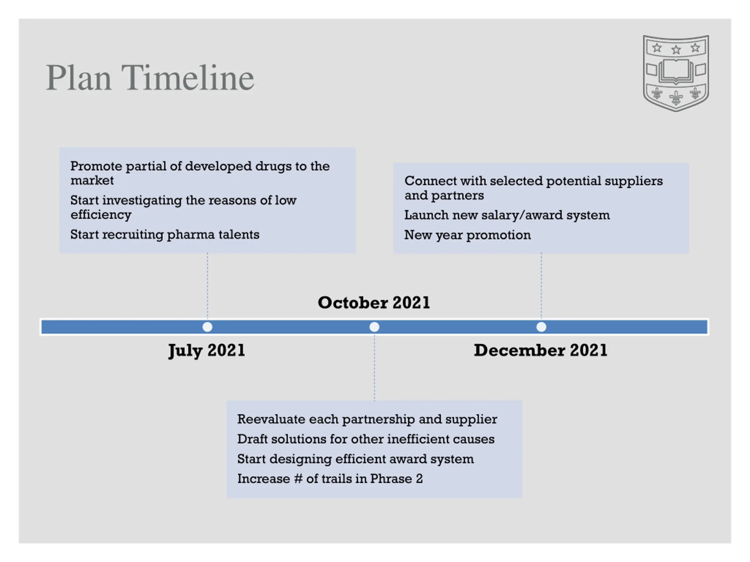Plan Timeline Promote partial of developed drugs to the market Start investigating the reasons of low efficiency Start recruiting pharma talents Connect with selected potential suppliers and partners Launch new salary/award system New year promotion October 2021 July 2021 December 2021 Reevaluate each partnership and supplier Draft solutions for other inefficient causes Start designing efficient award system Increase # of trails in Phrase 2