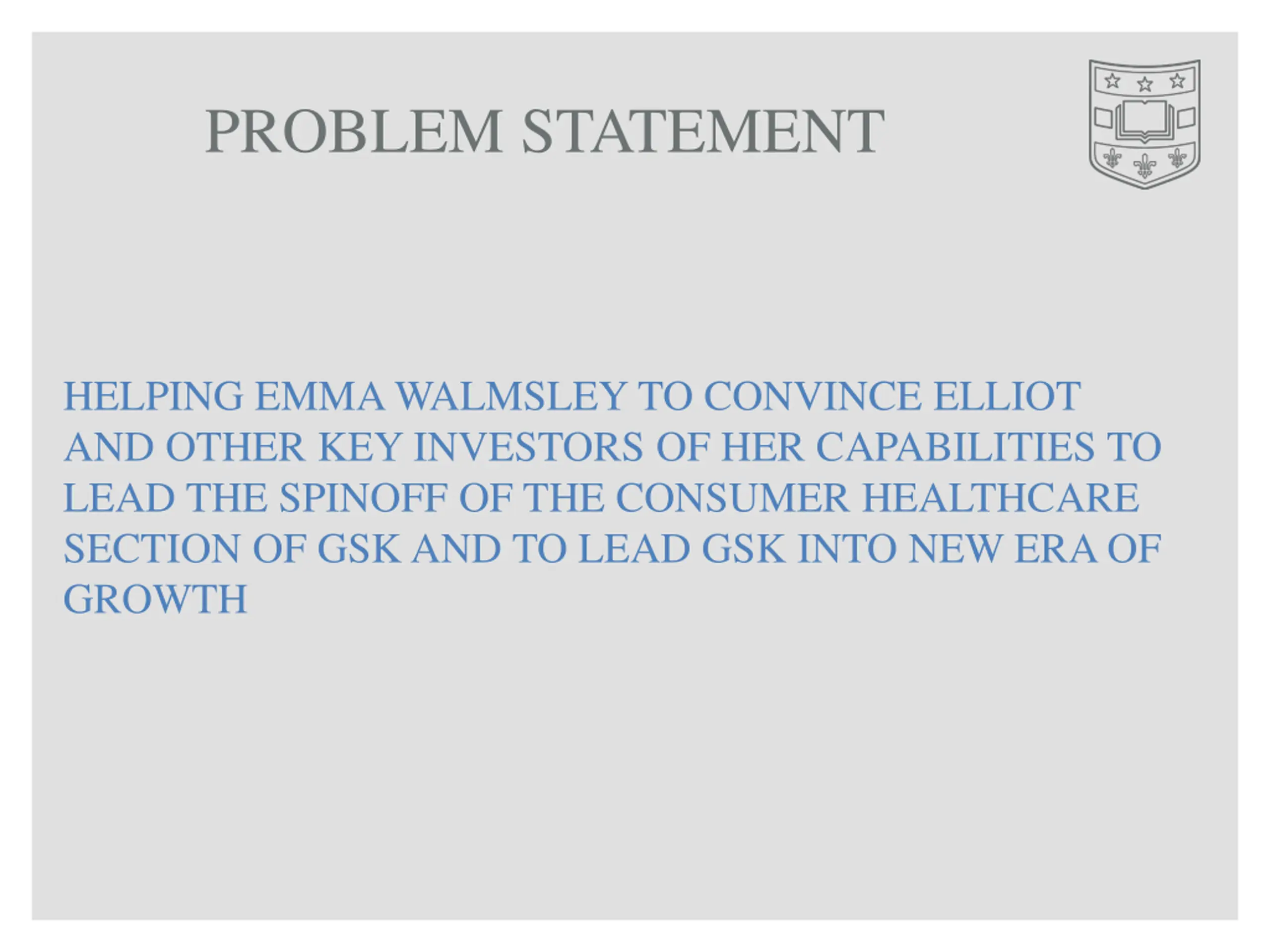 PROBLEM STATEMENT HELPING EMMA WALMSLEY TO CONVINCE ELLIOT AND OTHER KEY INVESTORS OF HER CAPABILITIES TO LEAD THE SPINOFF OF THE CONSUMER HEALTHCARE SECTION OF GSK AND TO LEAD GSK INTO NEW ERA OF GROWTH