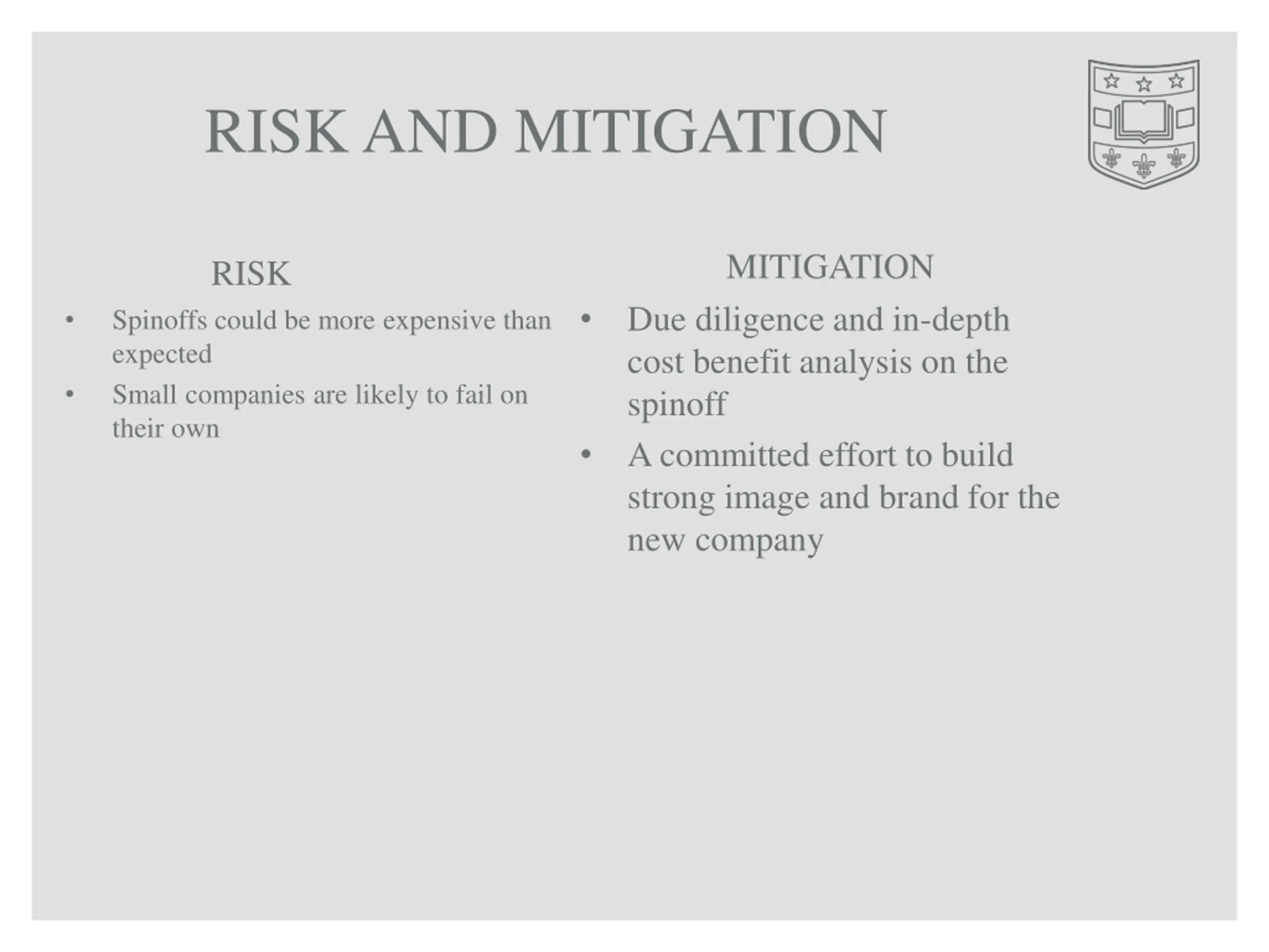 RISK AND MITIGATION MITIGATION Due diligence and in-depth cost benefit analysis on the spinoff A committed effort to build strong image and brand for the new company RISK Spinoffs could be more expensive than expected Small companies are likely to fail on their own