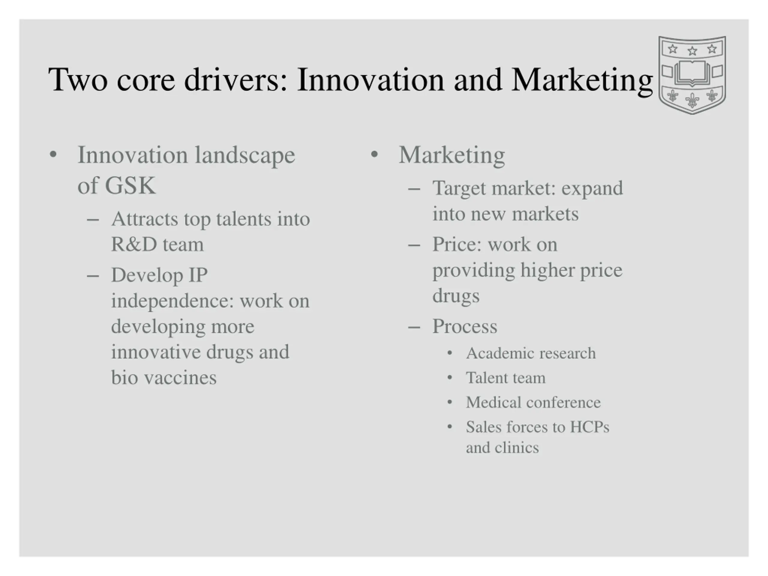 Two core drivers: Innovation and Marketing Innovation landscape of GSK Attracts top talents into R&D team Develop IP independence: work on developing more innovative drugs and bio vaccines Marketing Target market: expand into new markets Price: work on providing higher price drugs Process Academic research Talent team Medical conference Sales forces to HCPs and clinics