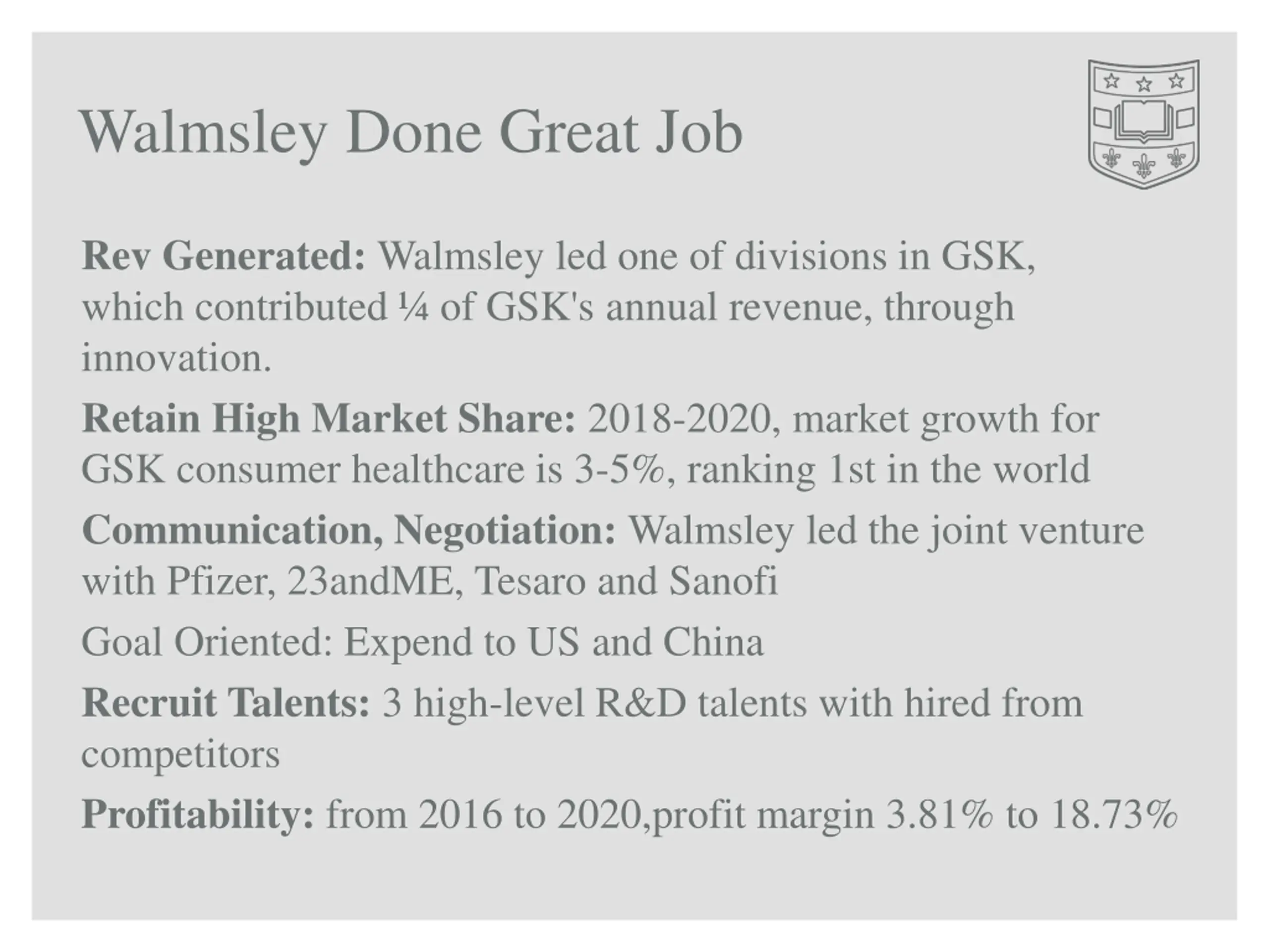 Walmsley Done Great Job Rev Generated: Walmsley led one of divisions in GSK, which contributed of GSK's annual revenue, through innovation. Retain High Market Share: 2018-2020, market growth for GSK consumer healthcare is 3-5%, ranking 1st in the world Communication, Negotiation: Walmsley led the joint venture with Pfizer, 23andME, Tesaro and Sanofi Goal Oriented: Expend to US and China Recruit Talents: 3 high-level R&D talents with hired from competitors Profitability: from 2016 to 2020,profit margin 3.81% to 18.73%
