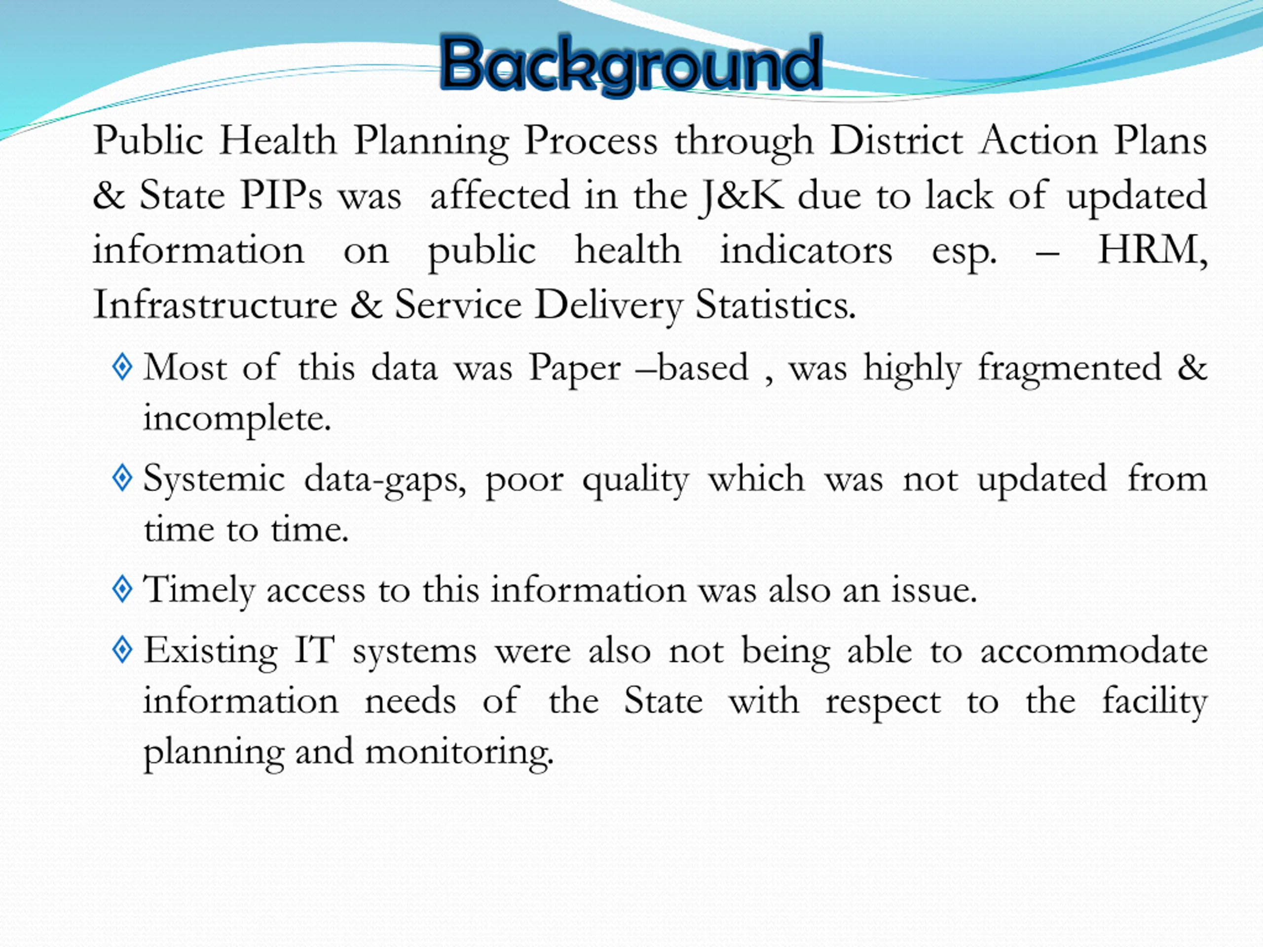 Background Public Health Planning Process through District Action Plans & State PIPs was affected in the J&K due to lack of updated information on public health indicators esp. HRM, Infrastructure & Service Delivery Statistics. Most of this data was Paper based , was highly fragmented & incomplete. Systemic data-gaps, poor quality which was not updated from time to time. Timely access to this information was also an issue. Existing IT systems were also not being able to accommodate information needs of the State with respect to the facility planning and monitoring.