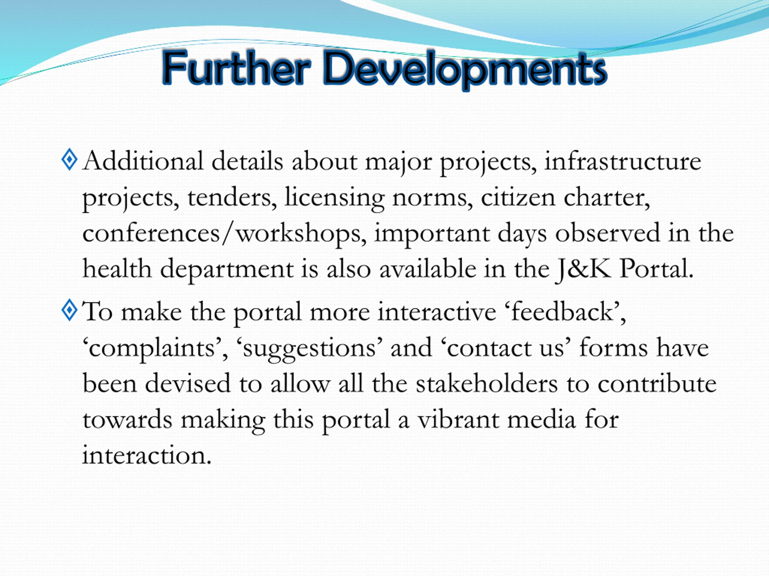 Further Developments Additional details about major projects, infrastructure projects, tenders, licensing norms, citizen charter, conferences/workshops, important days observed in the health department is also available in the J&K Portal. To make the portal more interactive feedback , complaints , suggestions and contact us forms have been devised to allow all the stakeholders to contribute towards making this portal a vibrant media for interaction.