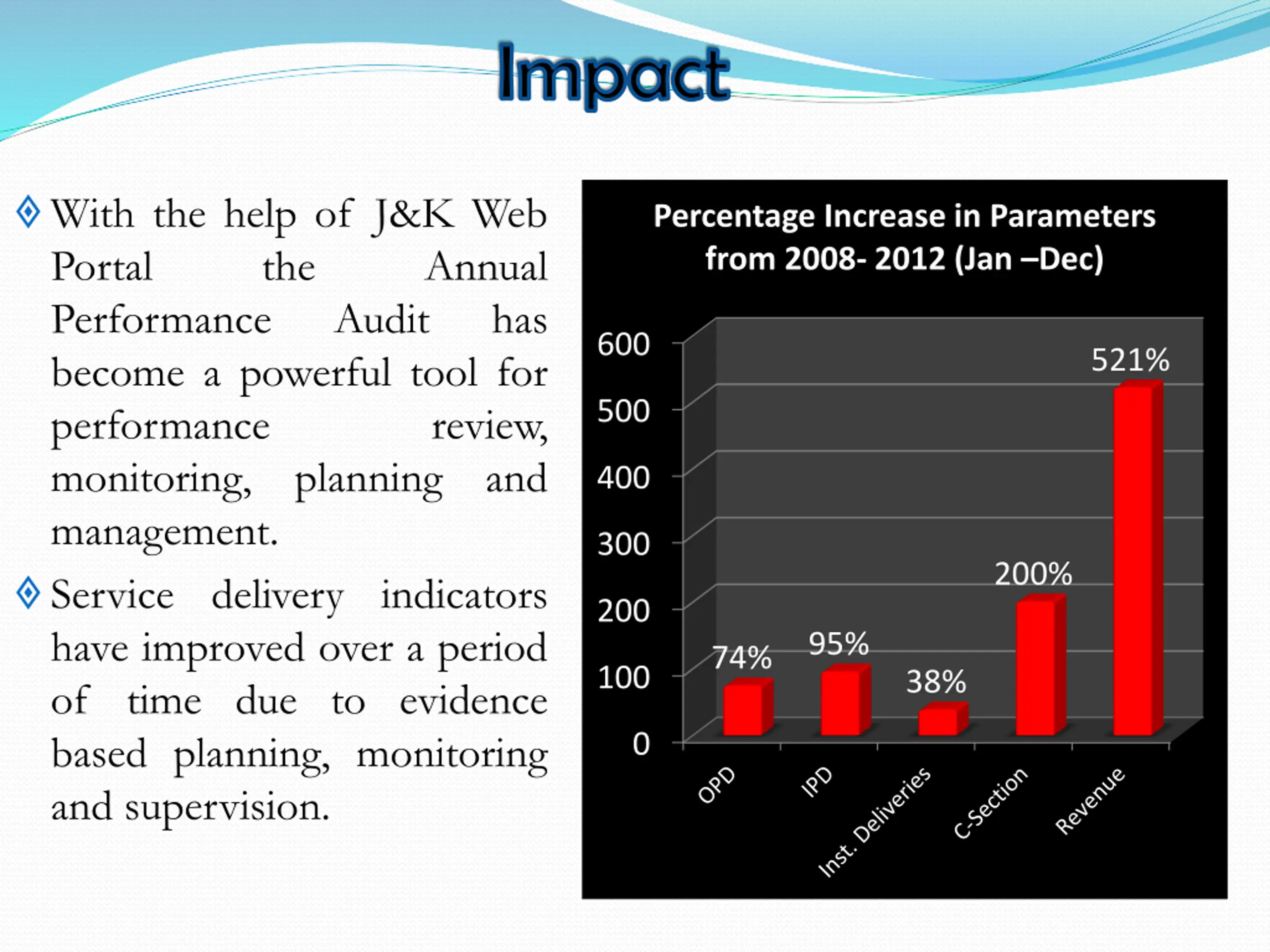 Impact With the help of J&K Web Portal the Performance become a powerful tool for performance monitoring, management. Service delivery indicators have improved over a period of time due to evidence based planning, monitoring and supervision. Percentage Increase in Parameters from 2008- 2012 (Jan Dec) Annual Audit has 600 521% 500 review, and planning 400 300 200% 200 95% 74% 100 38% 0