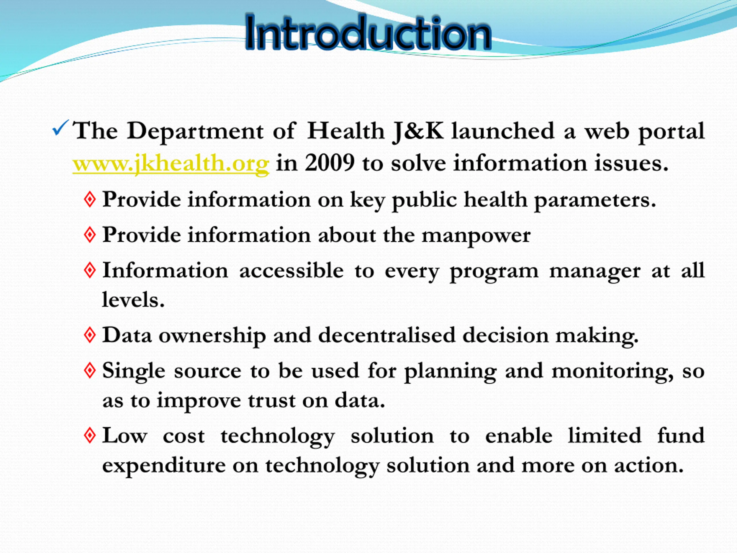 Introduction The Department of Health J&K launched a web portal www.jkhealth.org in 2009 to solve information issues. Provide information on key public health parameters. Provide information about the manpower Information accessible to every program manager at all levels. Data ownership and decentralised decision making. Single source to be used for planning and monitoring, so as to improve trust on data. Low cost technology solution to enable limited fund expenditure on technology solution and more on action.