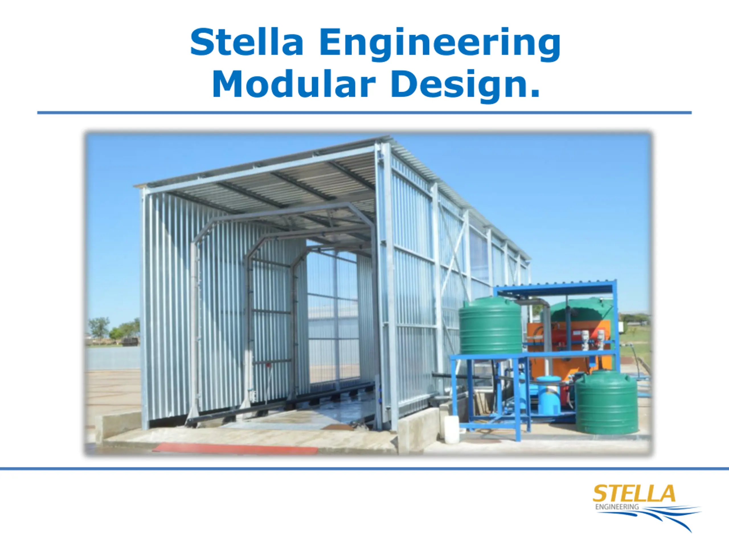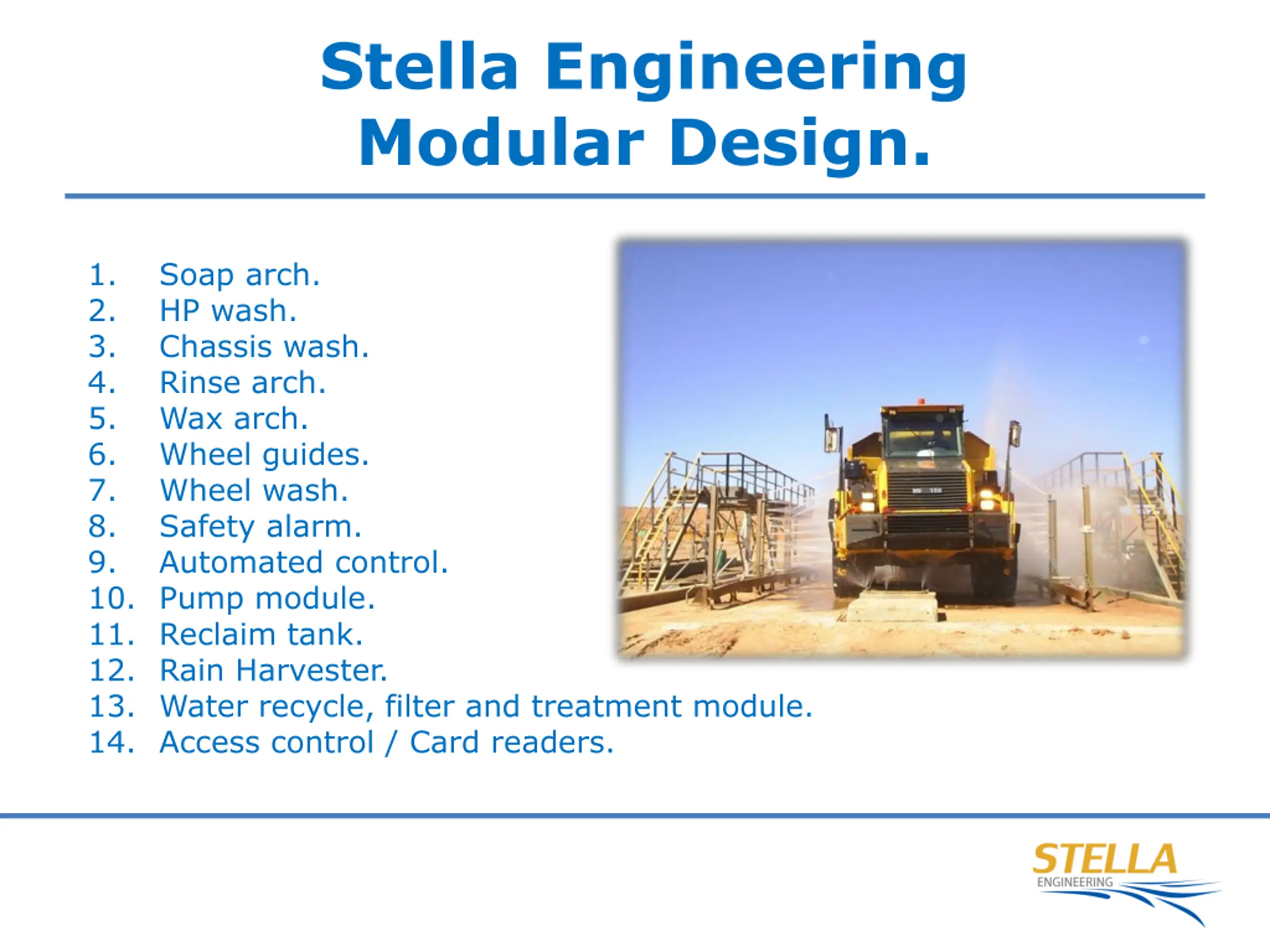 Stella Engineering Modular Design. 1. 2. 3. 4. 5. 6. 7. 8. 9. 10. Pump module. 11. Reclaim tank. 12. Rain Harvester. 13. Water recycle, filter and treatment module. 14. Access control / Card readers. Soap arch. HP wash. Chassis wash. Rinse arch. Wax arch. Wheel guides. Wheel wash. Safety alarm. Automated control.
