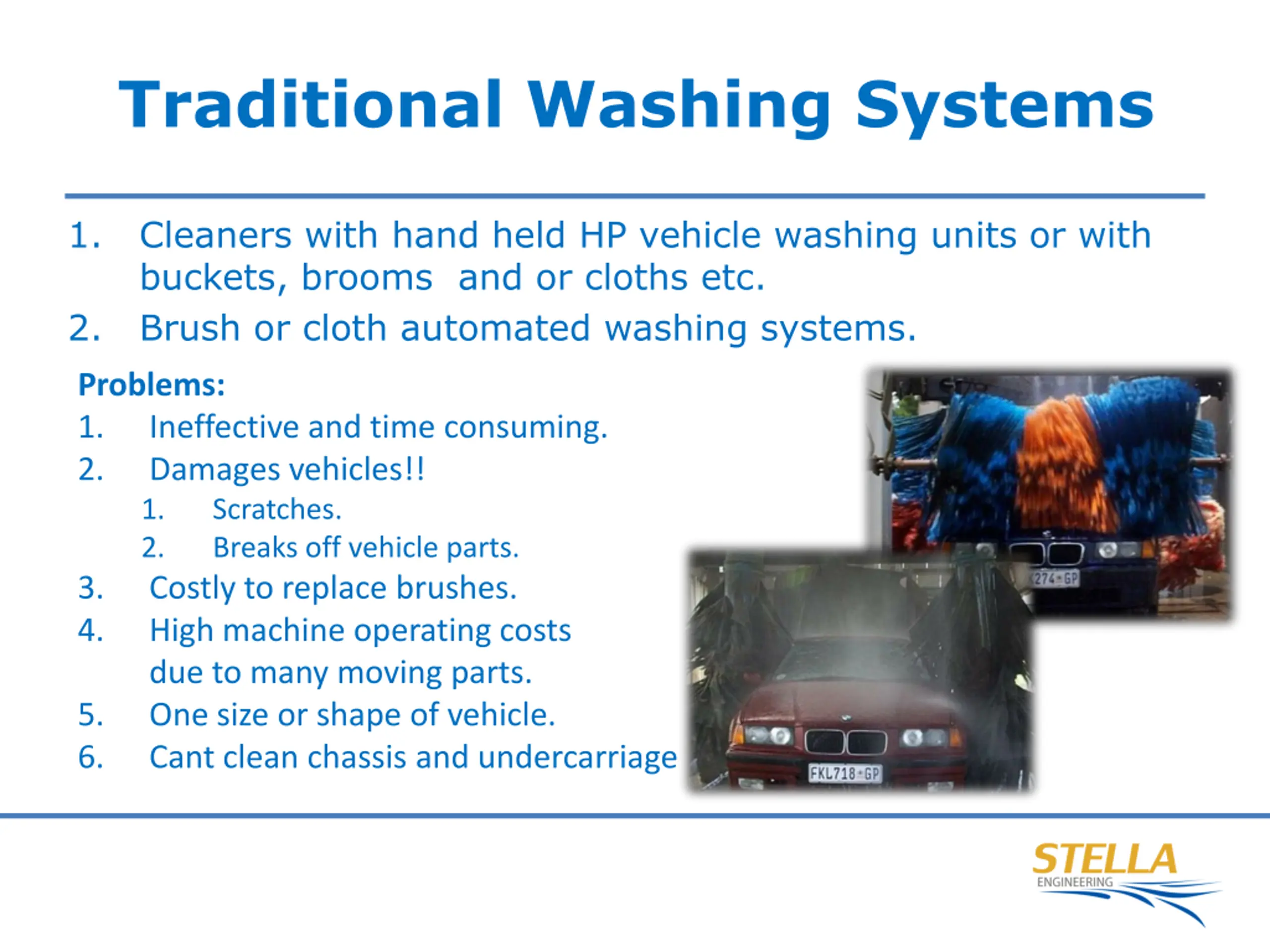 Traditional Washing Systems 1. Cleaners with hand held HP vehicle washing units or with buckets, brooms and or cloths etc. Brush or cloth automated washing systems. 2. Problems: 1. Ineffective and time consuming. 2. Damages vehicles!! 1. Scratches. 2. Breaks off vehicle parts. 3. Costly to replace brushes. 4. High machine operating costs due to many moving parts. 5. One size or shape of vehicle. 6. Cant clean chassis and undercarriage