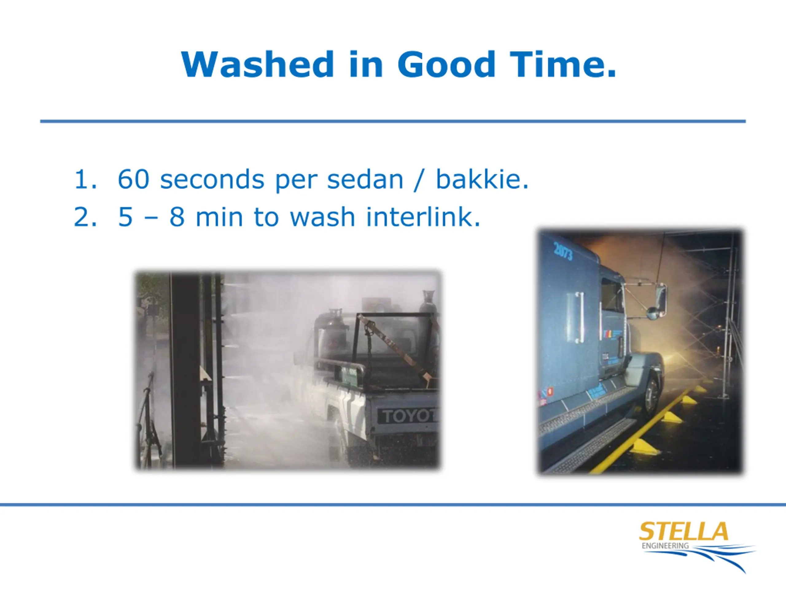 Washed in Good Time. 1. 60 seconds per sedan / bakkie. 2. 5 8 min to wash interlink.