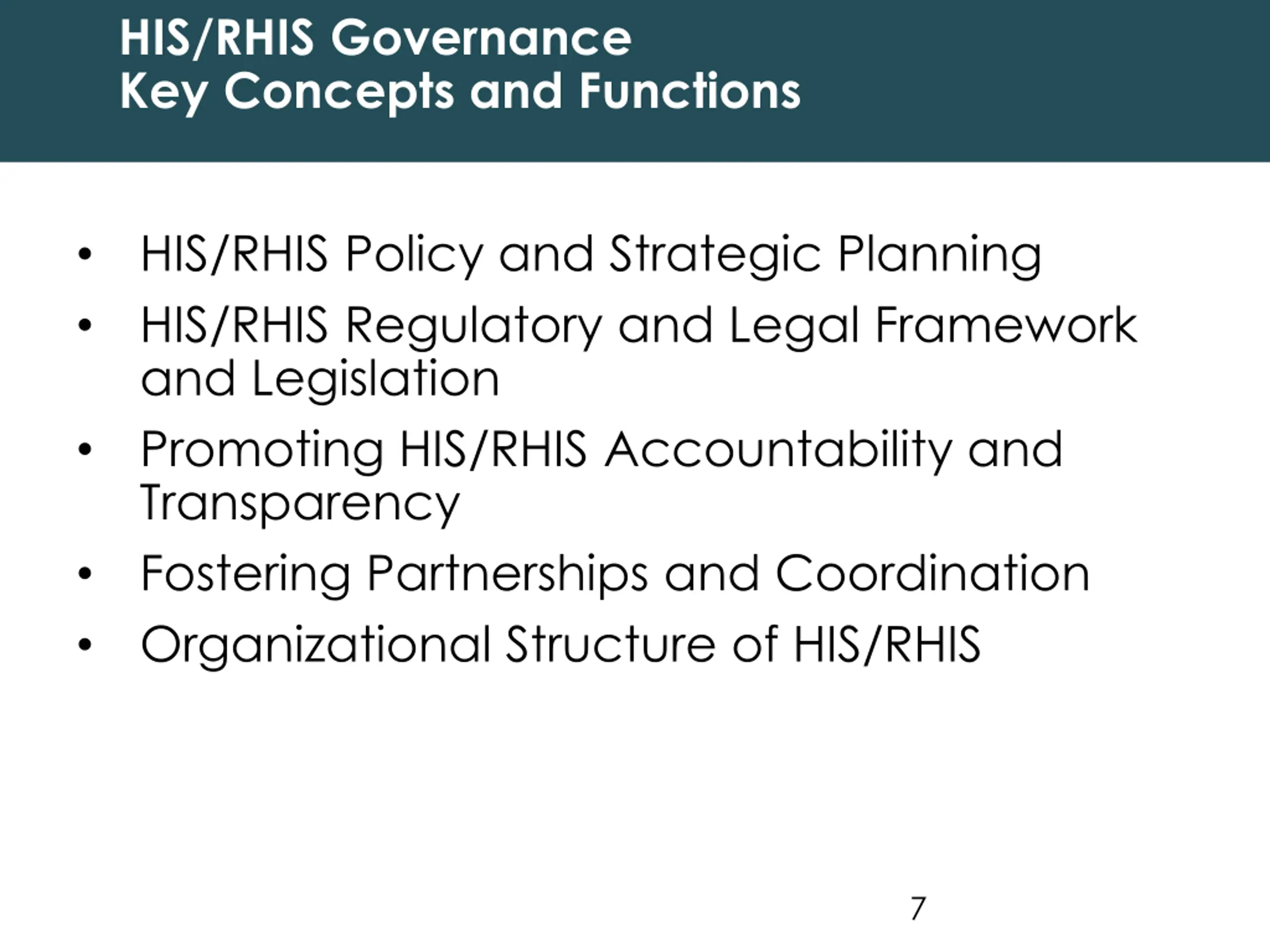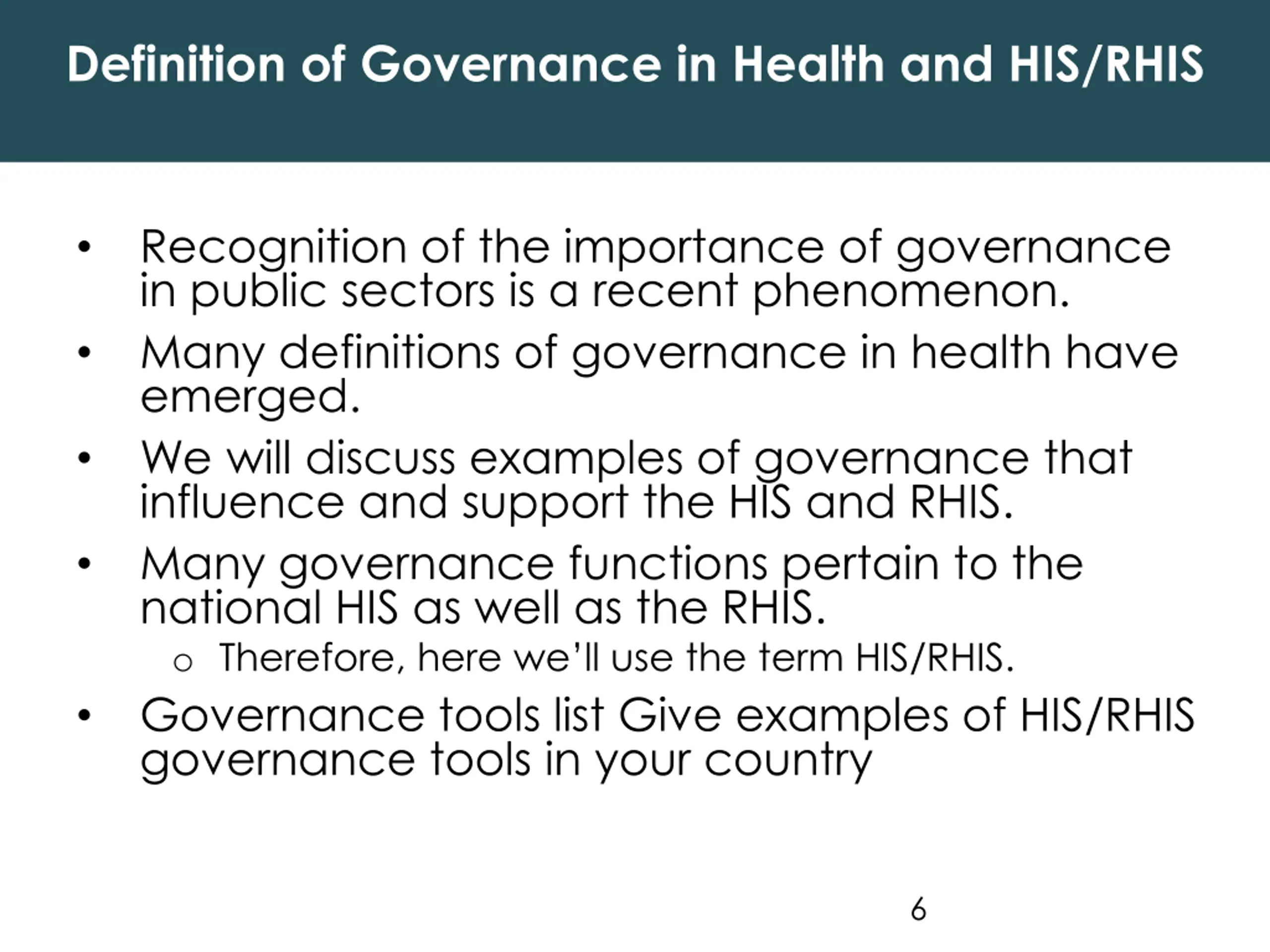 Definition of Governance in Health and HIS/RHIS Recognition of the importance of governance in public sectors is a recent phenomenon. Many definitions of governance in health have emerged. We will discuss examples of governance that influence and support the HIS and RHIS. Many governance functions pertain to the national HIS as well as the RHIS. o Therefore, here we ll use the term HIS/RHIS. Governance tools list Give examples of HIS/RHIS governance tools in your country 6