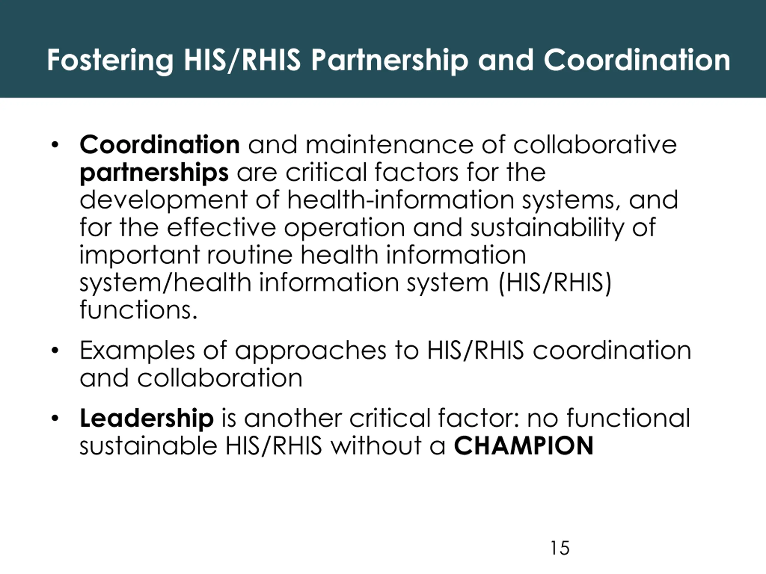 Fostering HIS/RHIS Partnership and Coordination Coordination and maintenance of collaborative partnerships are critical factors for the development of health-information systems, and for the effective operation and sustainability of important routine health information system/health information system (HIS/RHIS) functions. Examples of approaches to HIS/RHIS coordination and collaboration Leadership is another critical factor: no functional sustainable HIS/RHIS without a CHAMPION 15