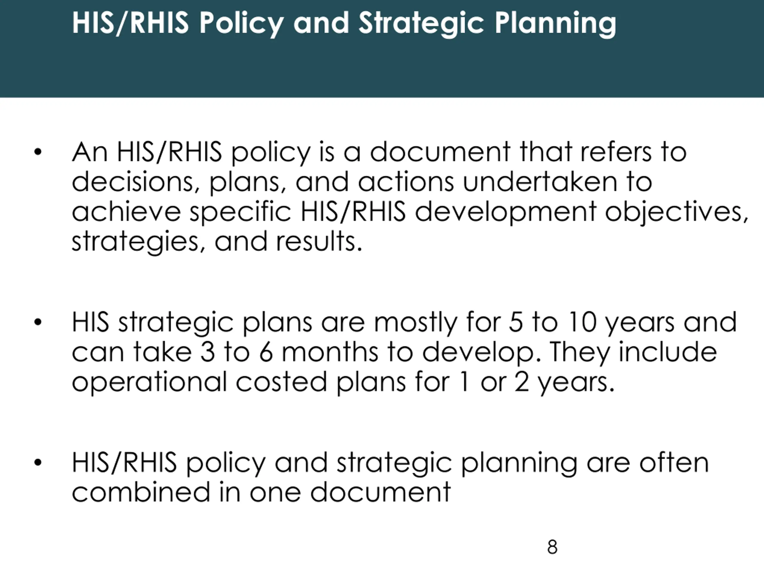 HIS/RHIS Policy and Strategic Planning An HIS/RHIS policy is a document that refers to decisions, plans, and actions undertaken to achieve specific HIS/RHIS development objectives, strategies, and results. HIS strategic plans are mostly for 5 to 10 years and can take 3 to 6 months to develop. They include operational costed plans for 1 or 2 years. HIS/RHIS policy and strategic planning are often combined in one document 8