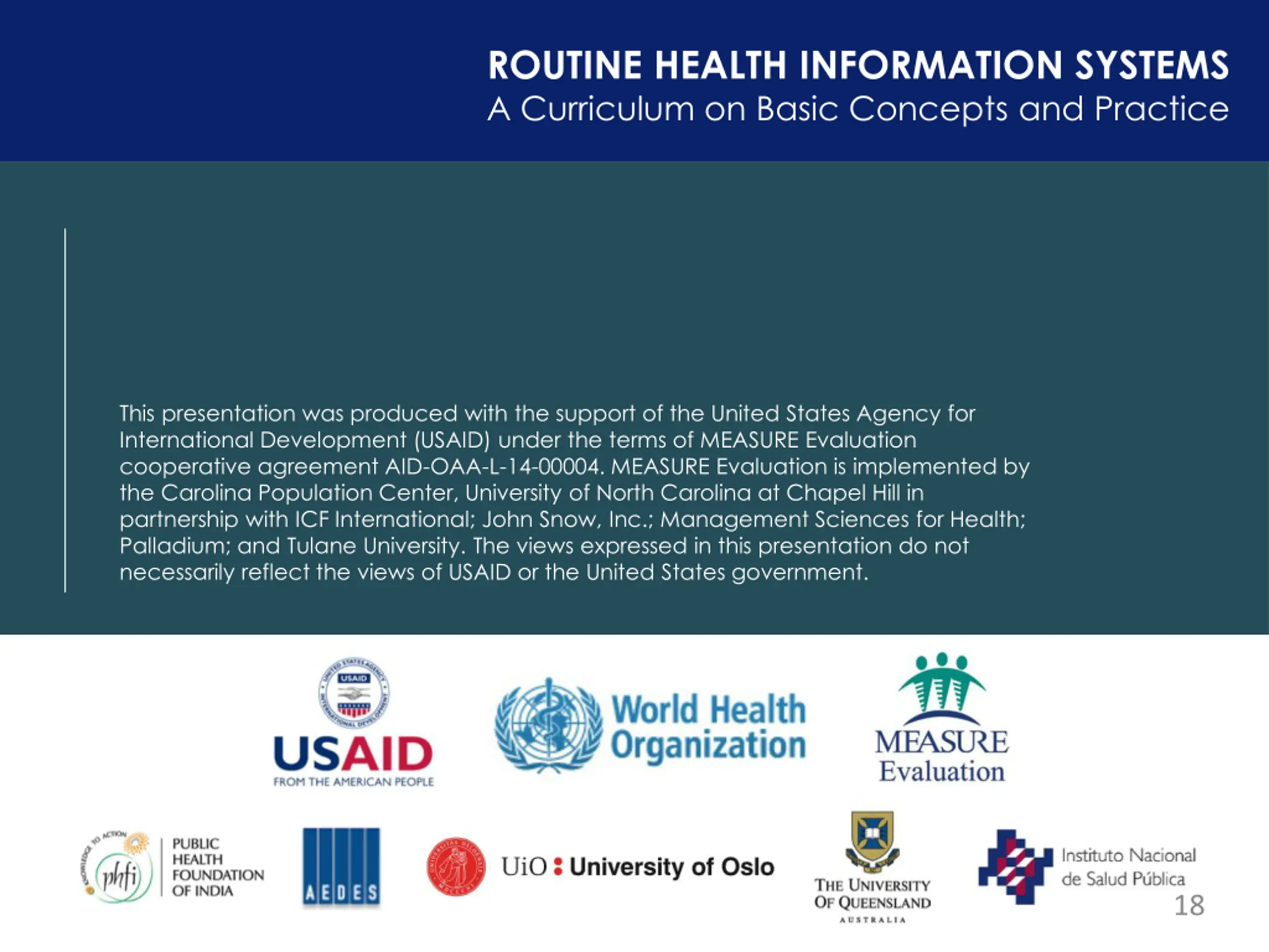 ROUTINE HEALTH INFORMATION SYSTEMS A Curriculum on Basic Concepts and Practice This presentation was produced with the support of the United States Agency for International Development (USAID) under the terms of MEASURE Evaluation cooperative agreement AID-OAA-L-14-00004. MEASURE Evaluation is implemented by the Carolina Population Center, University of North Carolina at Chapel Hill in partnership with ICF International; John Snow, Inc.; Management Sciences for Health; Palladium; and Tulane University. The views expressed in this presentation do not necessarily reflect the views of USAID or the United States government. 18