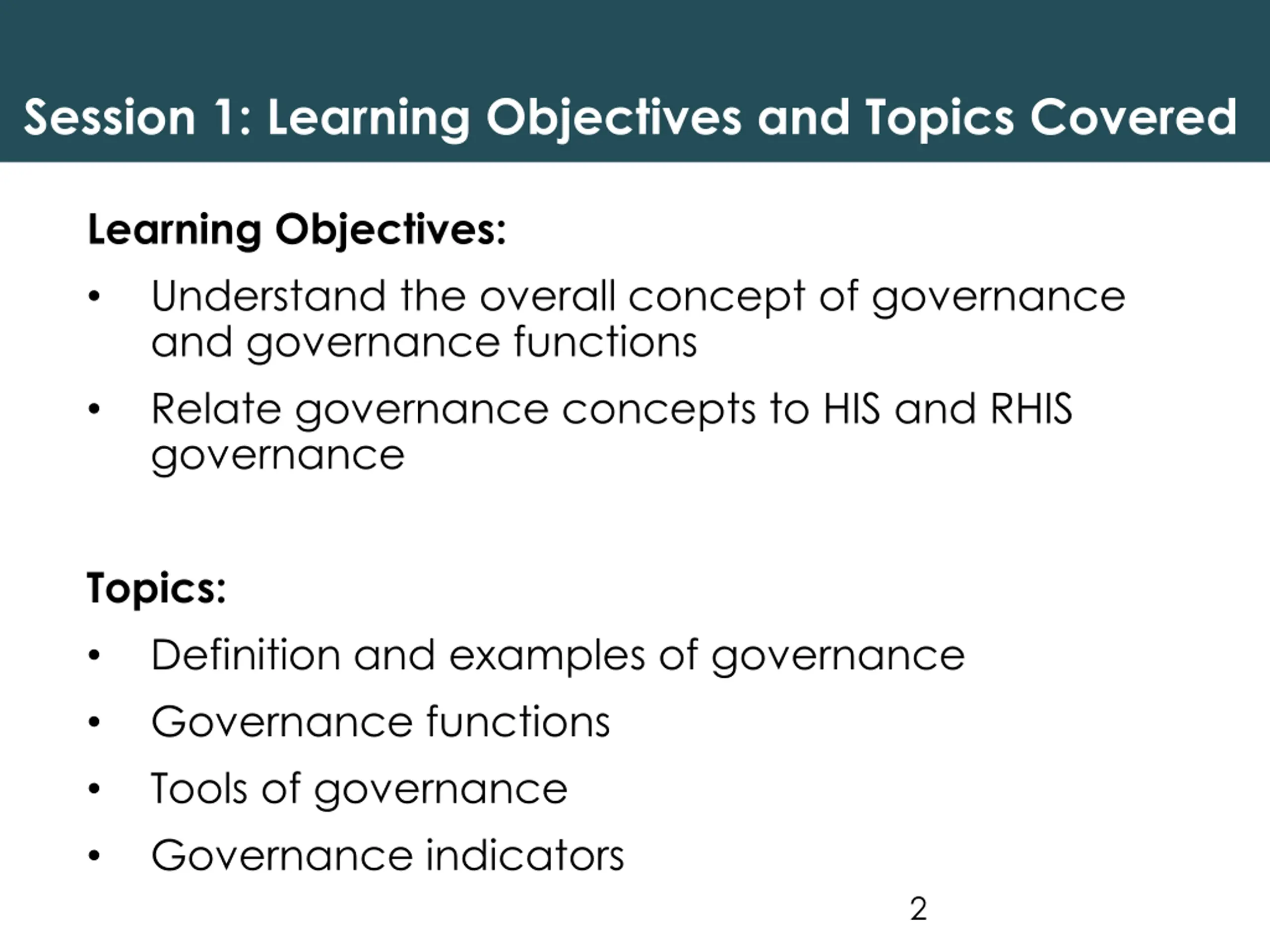 Session1: Learning Objectives and Topics Covered Learning Objectives: Understand the overall concept of governance and governance functions Relate governance concepts to HIS and RHIS governance Topics: Definition and examples of governance Governance functions Tools of governance Governance indicators 2