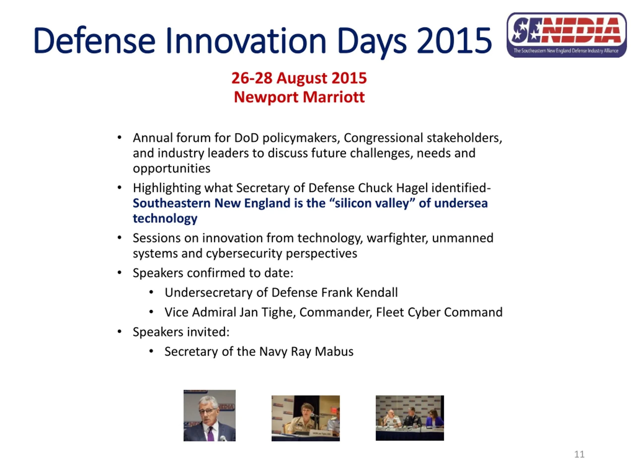 Defense Innovation Days 2015 Defense Innovation Days 2015 26-28 August 2015 Newport Marriott Annual forum for DoD policymakers, Congressional stakeholders, and industry leaders to discuss future challenges, needs and opportunities Highlighting what Secretary of Defense Chuck Hagel identified- Southeastern New England is the silicon valley of undersea technology Sessions on innovation from technology, warfighter, unmanned systems and cybersecurity perspectives Speakers confirmed to date: Undersecretary of Defense Frank Kendall Vice Admiral Jan Tighe, Commander, Fleet Cyber Command Speakers invited: Secretary of the Navy Ray Mabus 11