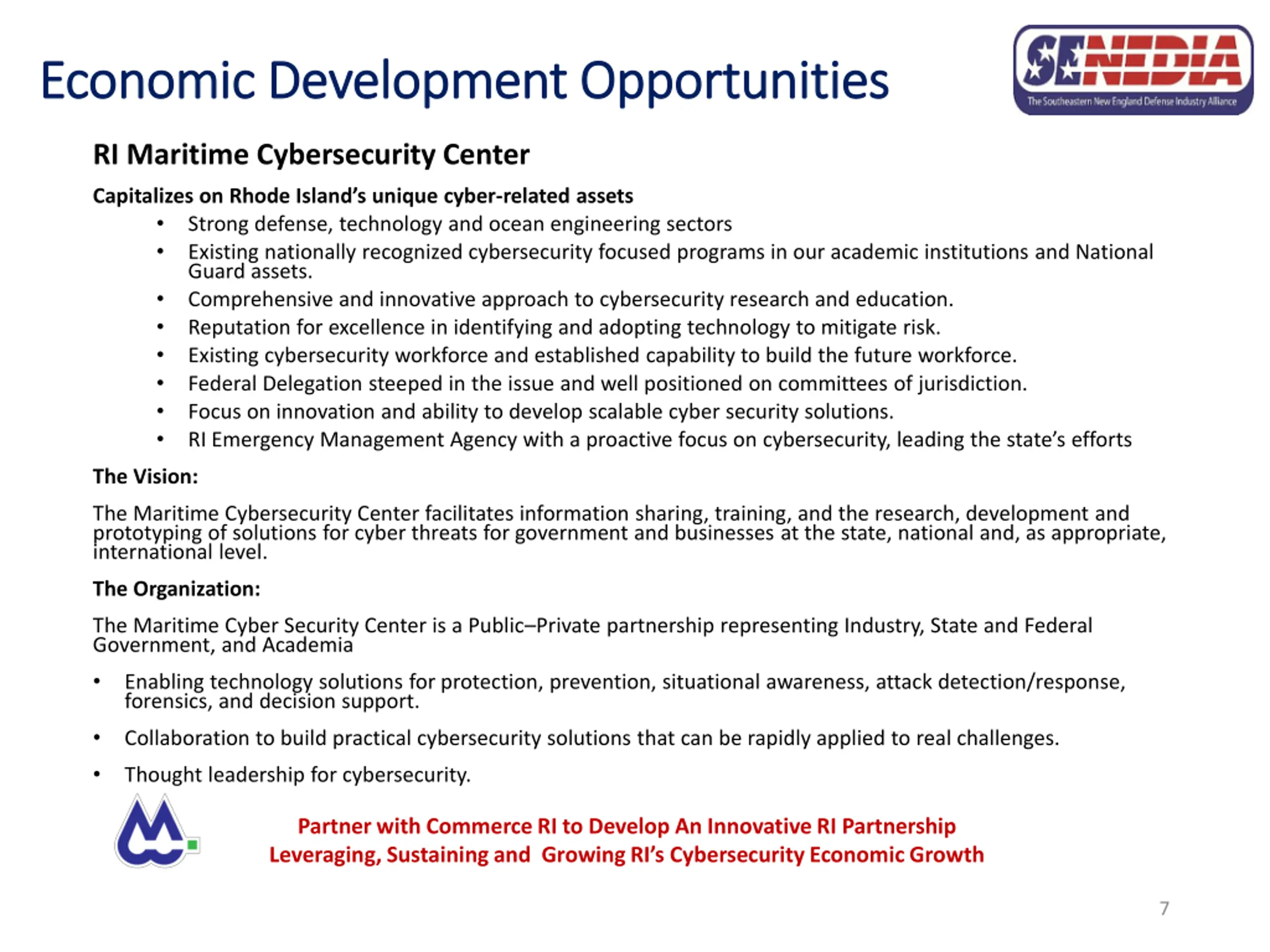 Economic Development Opportunities Economic Development Opportunities RI Maritime Cybersecurity Center Capitalizes on Rhode Island s unique cyber-related assets Strong defense, technology and ocean engineering sectors Existing nationally recognized cybersecurity focused programs in our academic institutions and National Guard assets. Comprehensive and innovative approach to cybersecurity research and education. Reputation for excellence in identifying and adopting technology to mitigate risk. Existing cybersecurity workforce and established capability to build the future workforce. Federal Delegation steeped in the issue and well positioned on committees of jurisdiction. Focus on innovation and ability to develop scalable cyber security solutions. RI Emergency Management Agency with a proactive focus on cybersecurity, leading the state s efforts The Vision: The Maritime Cybersecurity Center facilitates information sharing, training, and the research, development and prototyping of solutions for cyber threats for government and businesses at the state, national and, as appropriate, international level. The Organization: The Maritime Cyber Security Center is a Public Private partnership representing Industry, State and Federal Government, and Academia Enabling technology solutions for protection, prevention, situational awareness, attack detection/response, forensics, and decision support. Collaboration to build practical cybersecurity solutions that can be rapidly applied to real challenges. Thought leadership for cybersecurity. Partner with Commerce RI to Develop An Innovative RI Partnership Leveraging, Sustaining and Growing RI s Cybersecurity Economic Growth 7
