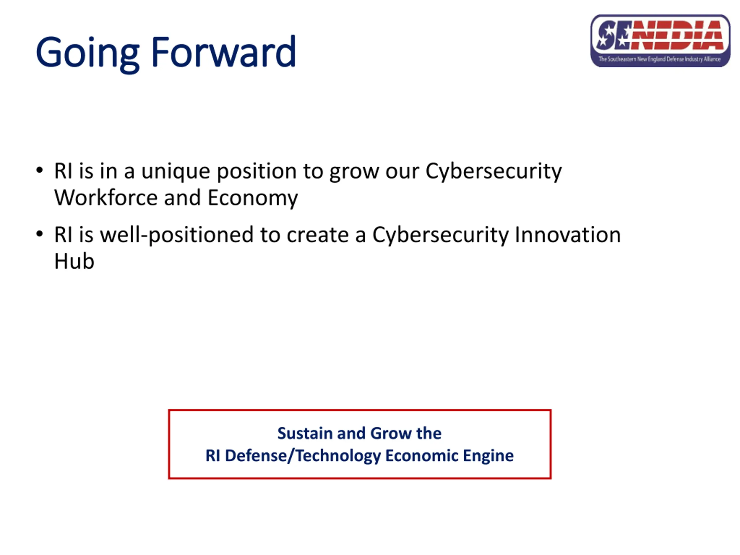 Going Forward Going Forward RI is in a unique position to grow our Cybersecurity Workforce and Economy RI is well-positioned to create a Cybersecurity Innovation Hub Sustain and Grow the RI Defense/Technology Economic Engine