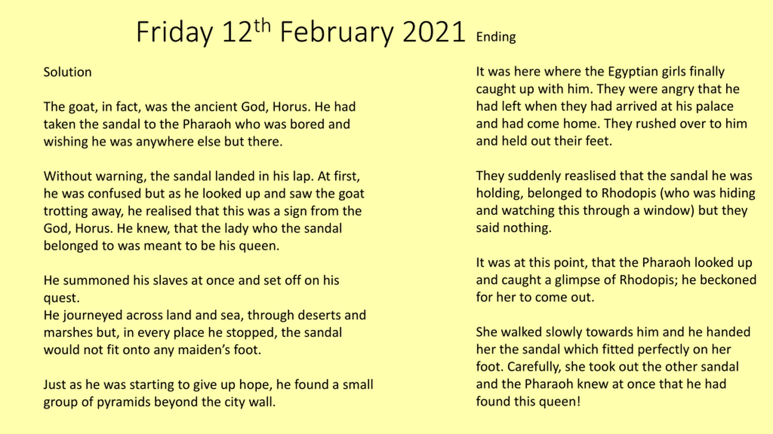 Friday 12th February 2021 Ending It was here where the Egyptian girls finally caught up with him. They were angry that he had left when they had arrived at his palace and had come home. They rushed over to him and held out their feet. Solution The goat, in fact, was the ancient God, Horus. He had taken the sandal to the Pharaoh who was bored and wishing he was anywhere else but there. They suddenly reaslised that the sandal he was holding, belonged to Rhodopis (who was hiding and watching this through a window) but they said nothing. Without warning, the sandal landed in his lap. At first, he was confused but as he looked up and saw the goat trotting away, he realised that this was a sign from the God, Horus. He knew, that the lady who the sandal belonged to was meant to be his queen. It was at this point, that the Pharaoh looked up and caught a glimpse of Rhodopis; he beckoned for her to come out. He summoned his slaves at once and set off on his quest. He journeyed across land and sea, through deserts and marshes but, in every place he stopped, the sandal would not fit onto any maiden s foot. She walked slowly towards him and he handed her the sandal which fitted perfectly on her foot. Carefully, she took out the other sandal and the Pharaoh knew at once that he had found this queen! Just as he was starting to give up hope, he found a small group of pyramids beyond the city wall.