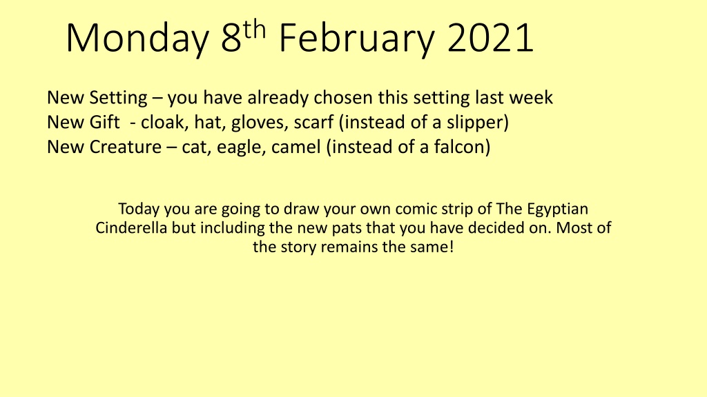 Monday 8thFebruary 2021 New Setting you have already chosen this setting last week New Gift - cloak, hat, gloves, scarf (instead of a slipper) New Creature cat, eagle, camel (instead of a falcon) Today you are going to draw your own comic strip of The Egyptian Cinderella but including the new pats that you have decided on. Most of the story remains the same!