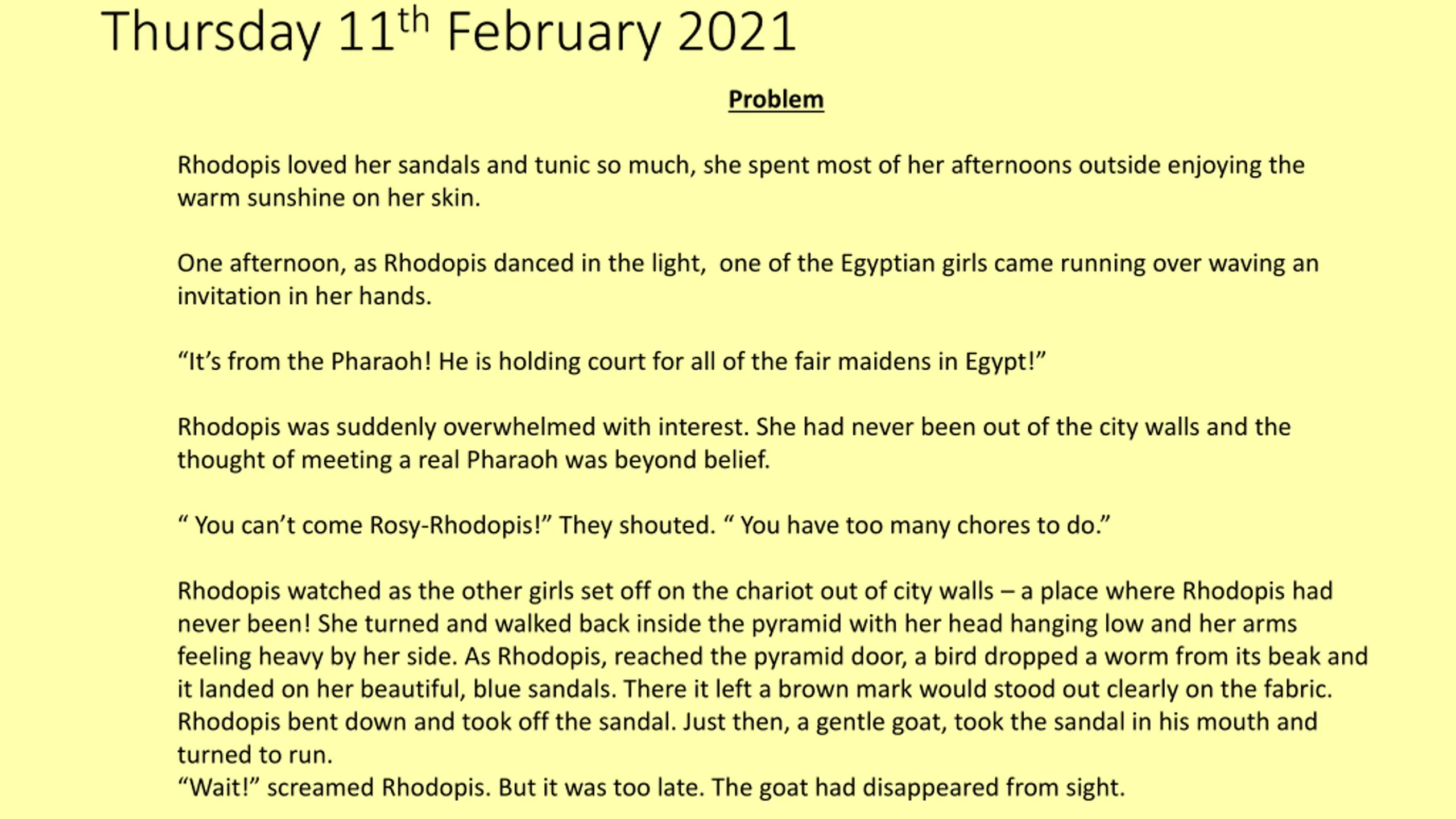 Thursday 11th February 2021 Problem Rhodopis loved her sandals and tunic so much, she spent most of her afternoons outside enjoying the warm sunshine on her skin. One afternoon, as Rhodopis danced in the light, one of the Egyptian girls came running over waving an invitation in her hands. It s from the Pharaoh! He is holding court for all of the fair maidens in Egypt! Rhodopis was suddenly overwhelmed with interest. She had never been out of the city walls and the thought of meeting a real Pharaoh was beyond belief. You can t come Rosy-Rhodopis! They shouted. You have too many chores to do. Rhodopis watched as the other girls set off on the chariot out of city walls a place where Rhodopis had never been! She turned and walked back inside the pyramid with her head hanging low and her arms feeling heavy by her side. As Rhodopis, reached the pyramid door, a bird dropped a worm from its beak and it landed on her beautiful, blue sandals. There it left a brown mark would stood out clearly on the fabric. Rhodopis bent down and took off the sandal. Just then, a gentle goat, took the sandal in his mouth and turned to run. Wait! screamed Rhodopis. But it was too late. The goat had disappeared from sight.