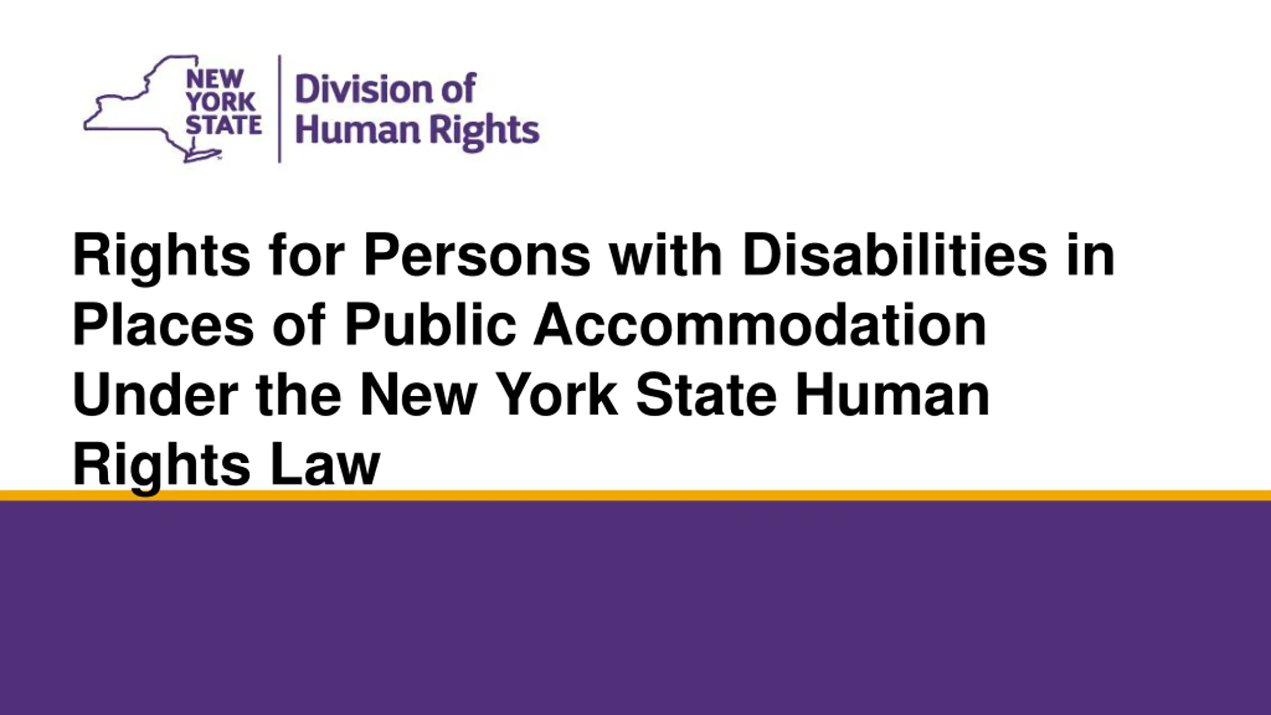 "Learn about the rights for persons with disabilities in places of public accommodation under the New York State Human Rights Law (NYSHRL), including covered conditions, differences from the ADA, definitions of disability, and enforcement by the NY Division of Human Rights."