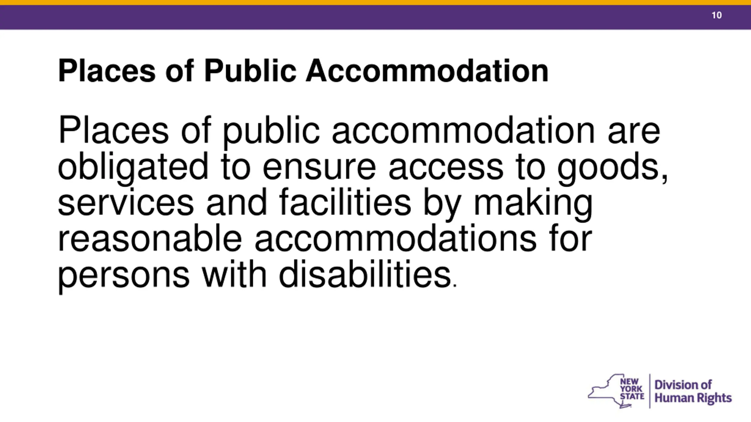10 Places of Public Accommodation Places of public accommodation are obligated to ensure access to goods, services and facilities by making reasonable accommodations for persons with disabilities.
