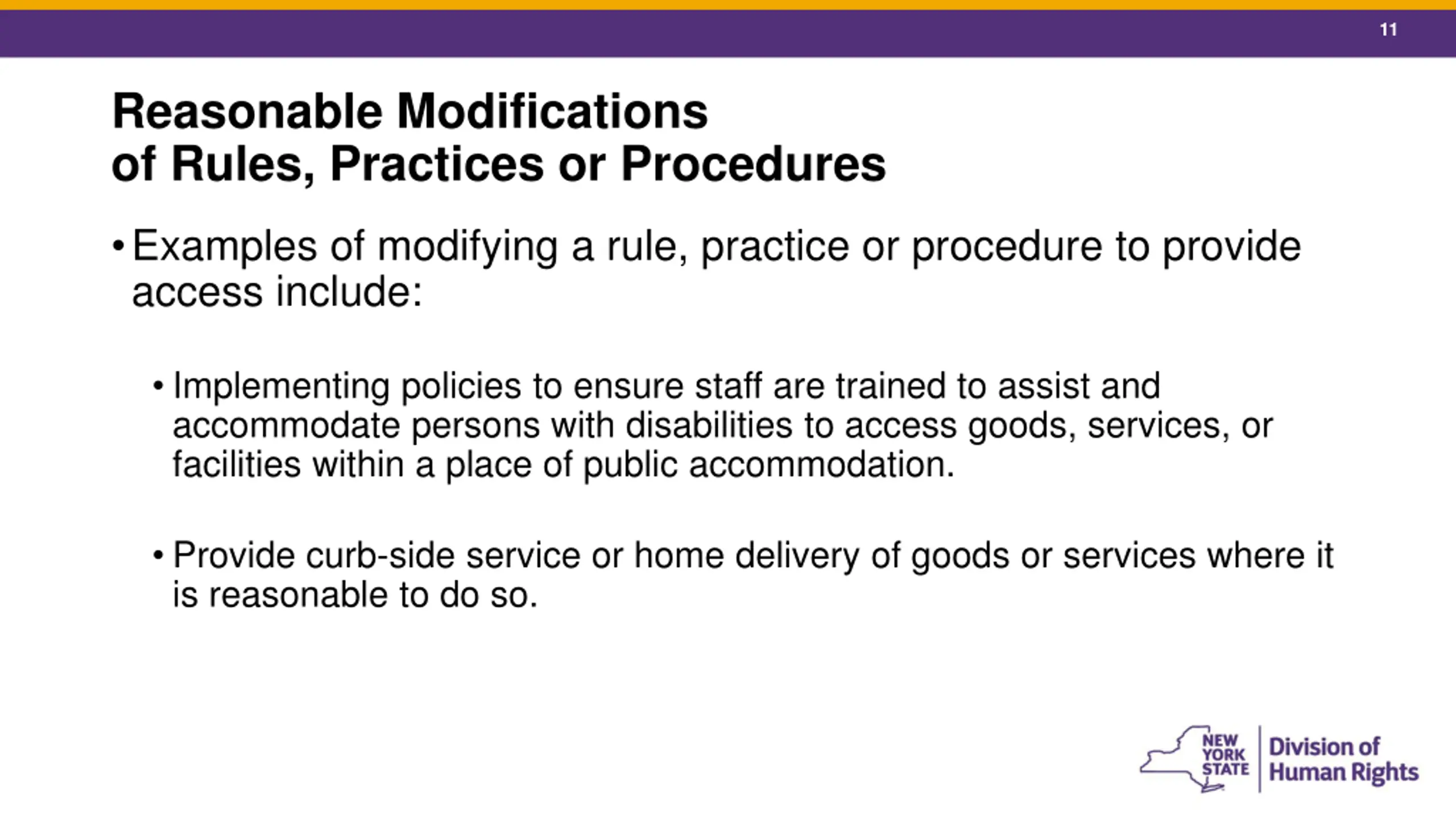 11 Reasonable Modifications of Rules, Practices or Procedures Examples of modifying a rule, practice or procedure to provide access include: Implementing policies to ensure staff are trained to assist and accommodate persons with disabilities to access goods, services, or facilities within a place of public accommodation. Provide curb-side service or home delivery of goods or services where it is reasonable to do so.