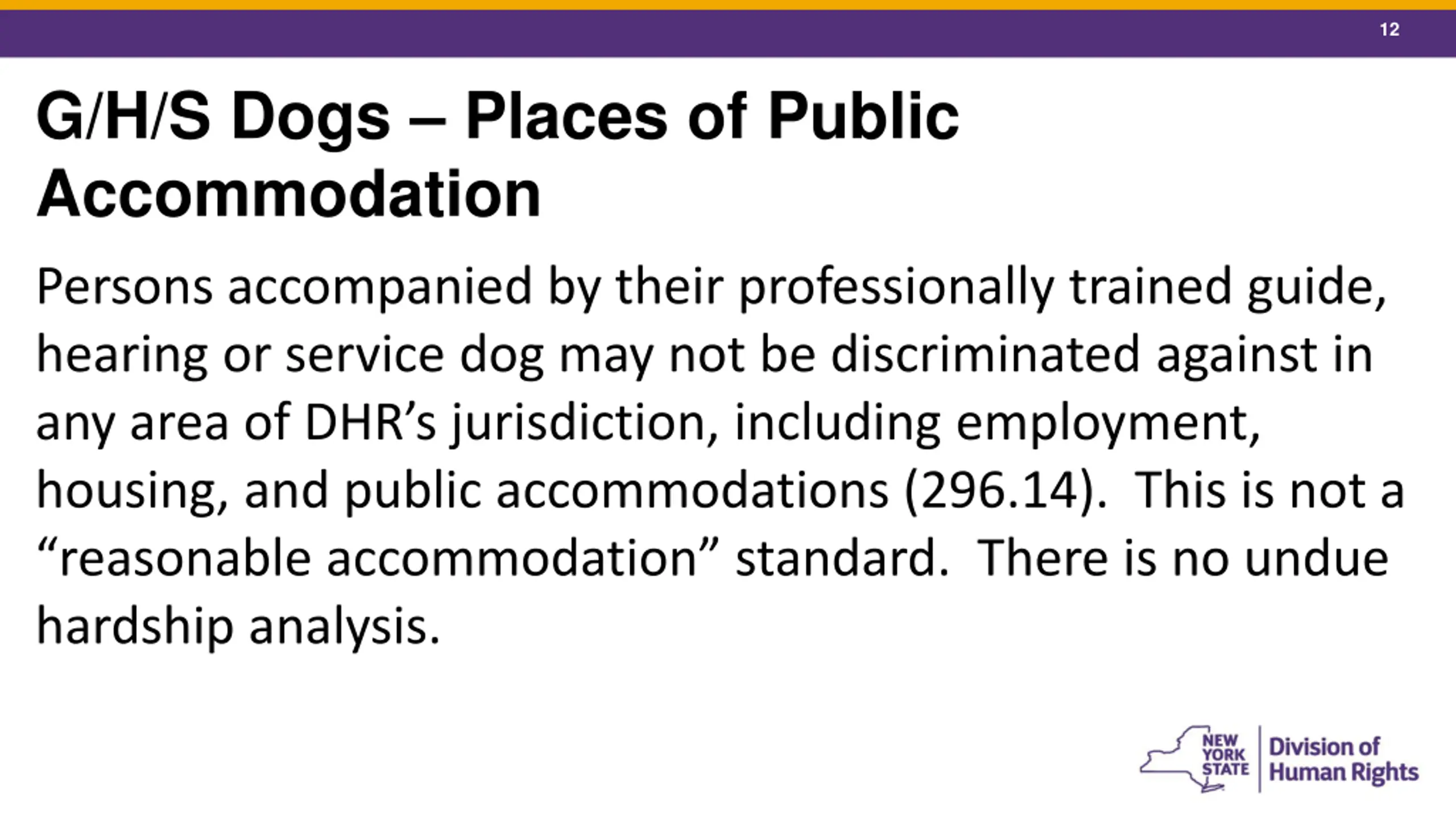 12 G/H/S Dogs Places of Public Accommodation Persons accompanied by their professionally trained guide, hearing or service dog may not be discriminated against in any area of DHR s jurisdiction, including employment, housing, and public accommodations (296.14). This is not a reasonable accommodation standard. There is no undue hardship analysis.