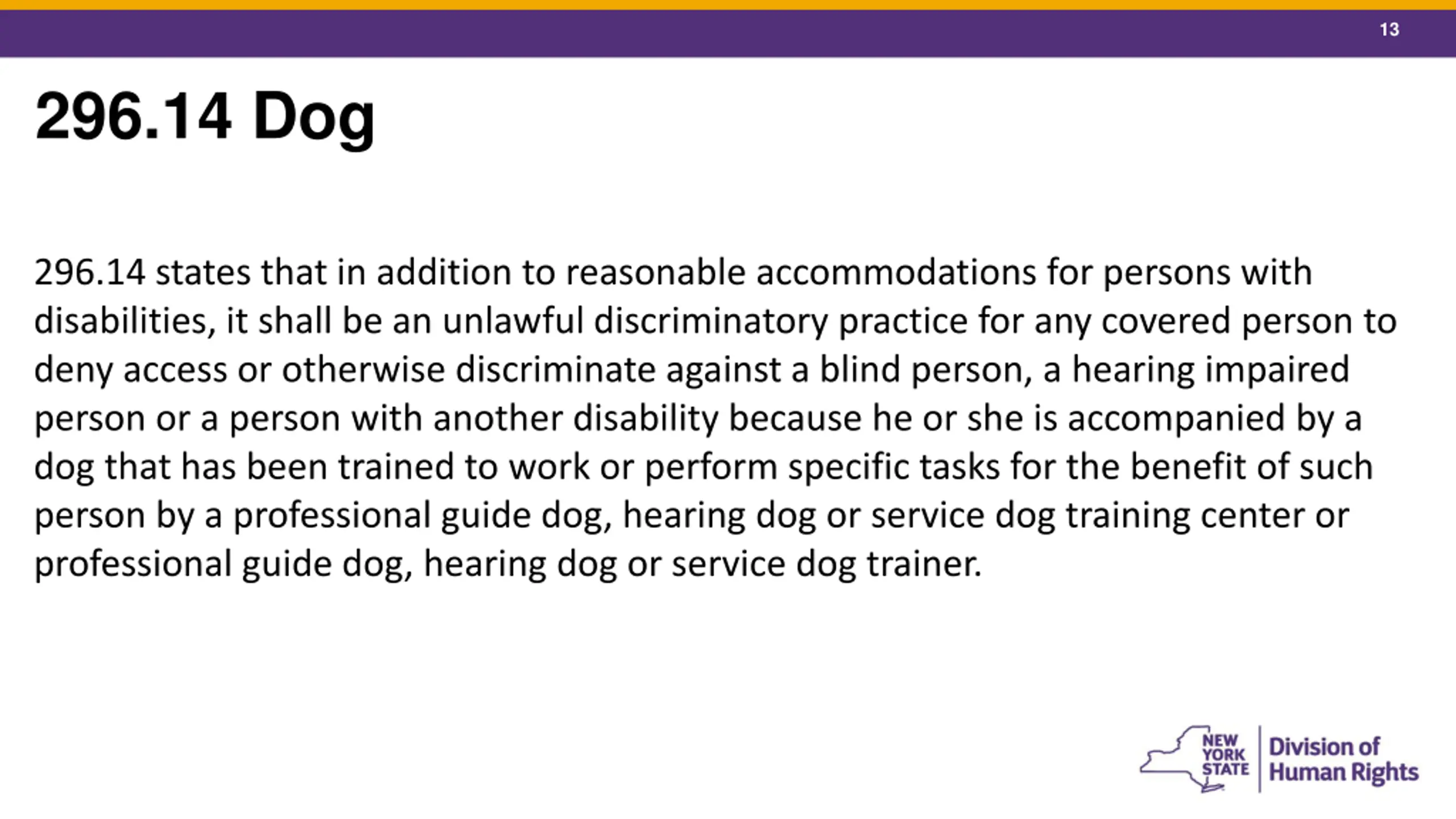 13 296.14 Dog 296.14 states that in addition to reasonable accommodations for persons with disabilities, it shall be an unlawful discriminatory practice for any covered person to deny access or otherwise discriminate against a blind person, a hearing impaired person or a person with another disability because he or she is accompanied by a dog that has been trained to work or perform specific tasks for the benefit of such person by a professional guide dog, hearing dog or service dog training center or professional guide dog, hearing dog or service dog trainer.