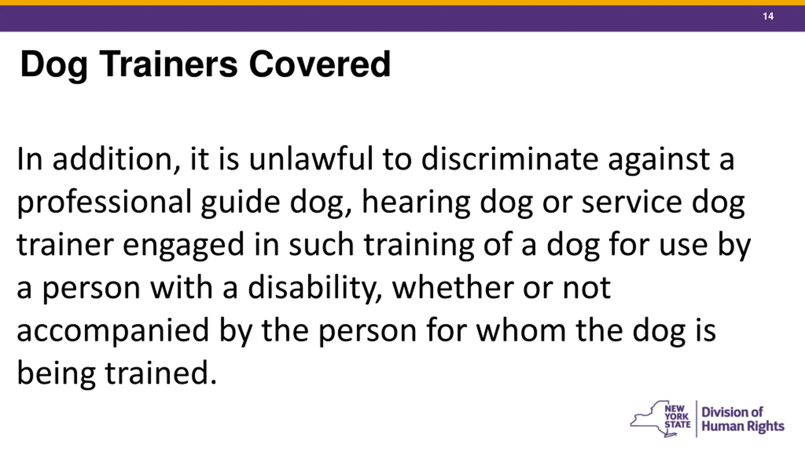 14 Dog Trainers Covered In addition, it is unlawful to discriminate against a professional guide dog, hearing dog or service dog trainer engaged in such training of a dog for use by a person with a disability, whether or not accompanied by the person for whom the dog is being trained.