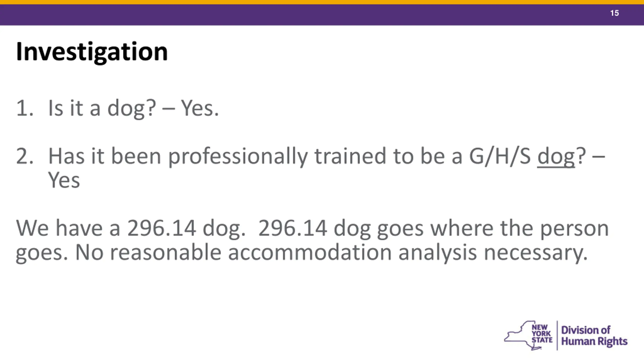 15 Investigation 1. Is it a dog? Yes. 2. Has it been professionally trained to be a G/H/S dog? Yes We have a 296.14 dog. 296.14 dog goes where the person goes. No reasonable accommodation analysis necessary.