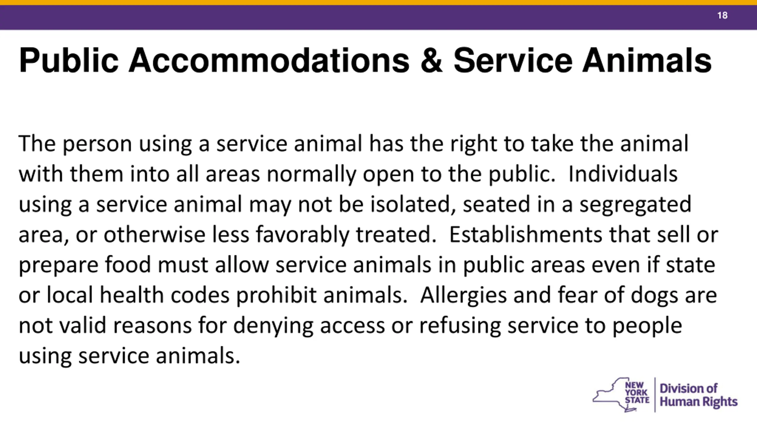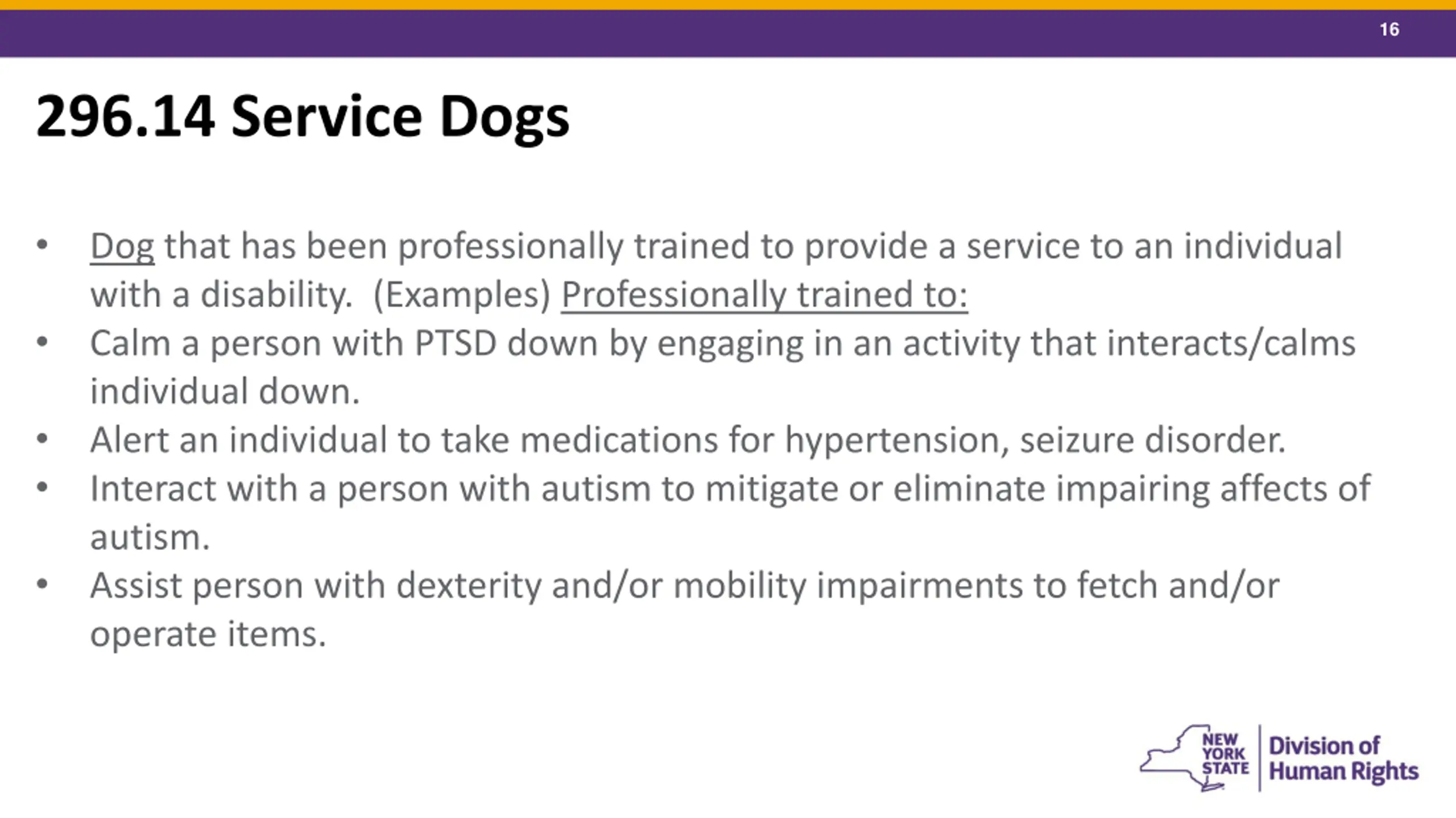 17 296.14 Service Dogs Emotional support / companion dogs are NOT service dogs in public accommodations cases. NYSHRL has adopted ADA requirements = service animal are dogs or miniature horses. Does not include emotional support or companion dogs.