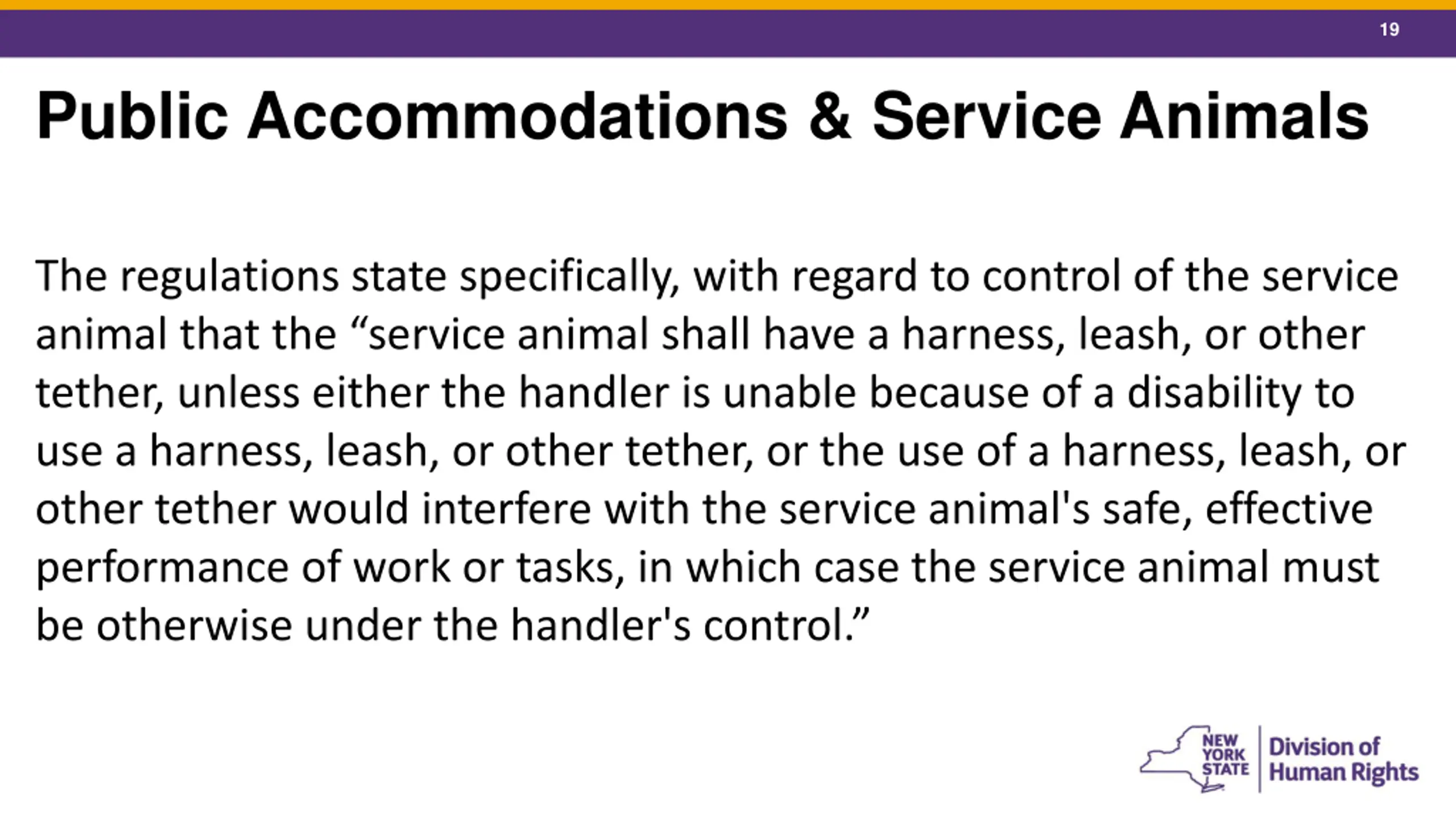 19 Public Accommodations & Service Animals The regulations state specifically, with regard to control of the service animal that the service animal shall have a harness, leash, or other tether, unless either the handler is unable because of a disability to use a harness, leash, or other tether, or the use of a harness, leash, or other tether would interfere with the service animal's safe, effective performance of work or tasks, in which case the service animal must be otherwise under the handler's control.