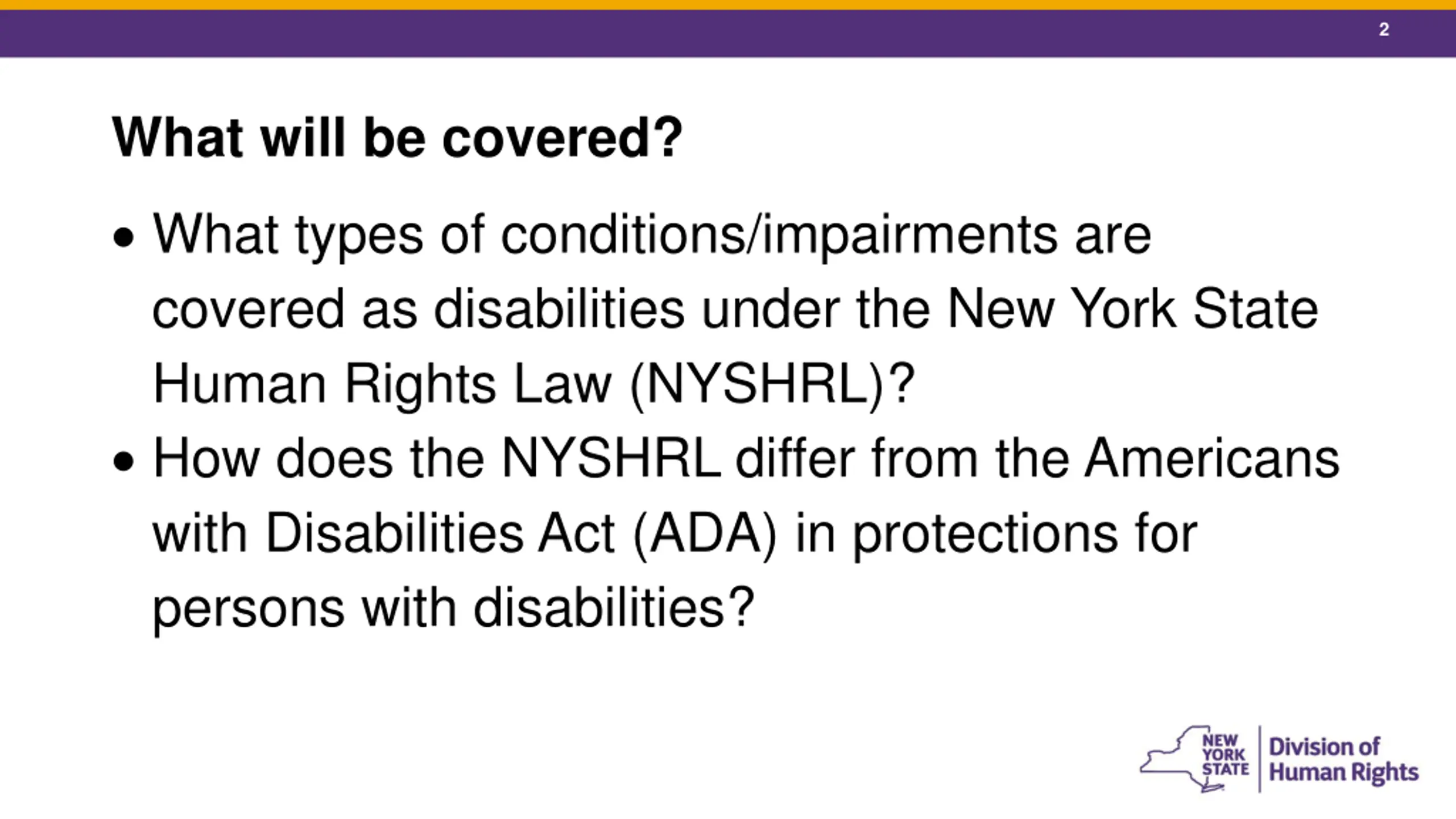 2 What will be covered? What types of conditions/impairments are covered as disabilities under the New York State Human Rights Law (NYSHRL)? How does the NYSHRL differ from the Americans with Disabilities Act (ADA) in protections for persons with disabilities?