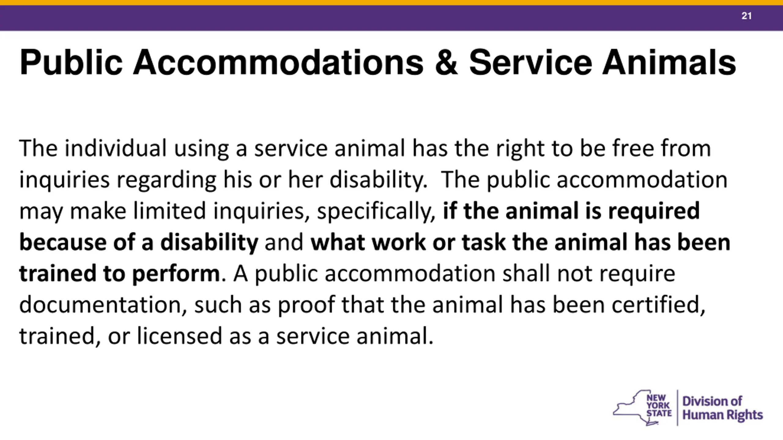 21 Public Accommodations & Service Animals The individual using a service animal has the right to be free from inquiries regarding his or her disability. The public accommodation may make limited inquiries, specifically, if the animal is required because of a disability and what work or task the animal has been trained to perform. A public accommodation shall not require documentation, such as proof that the animal has been certified, trained, or licensed as a service animal.