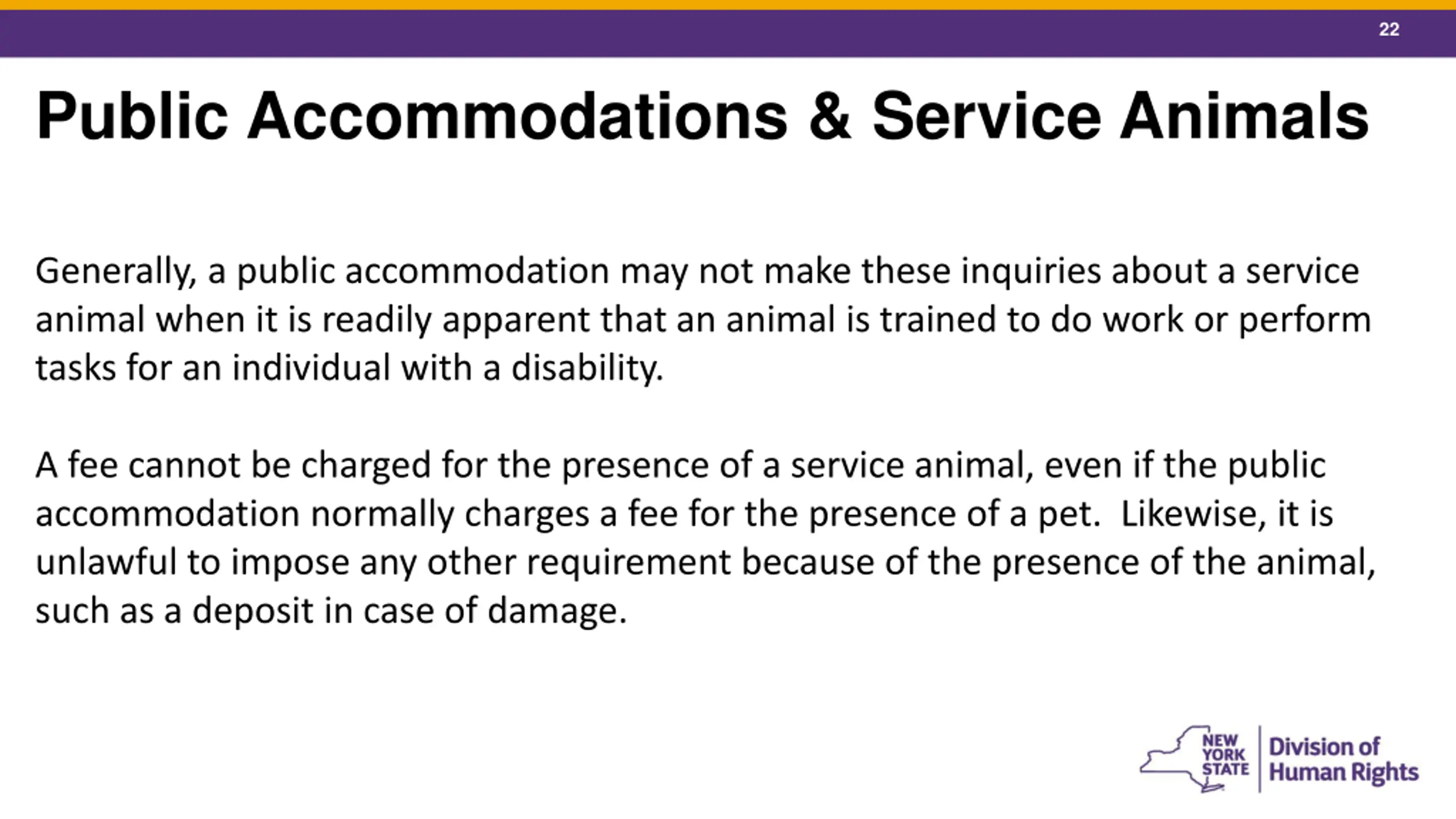 22 Public Accommodations & Service Animals Generally, a public accommodation may not make these inquiries about a service animal when it is readily apparent that an animal is trained to do work or perform tasks for an individual with a disability. A fee cannot be charged for the presence of a service animal, even if the public accommodation normally charges a fee for the presence of a pet. Likewise, it is unlawful to impose any other requirement because of the presence of the animal, such as a deposit in case of damage.