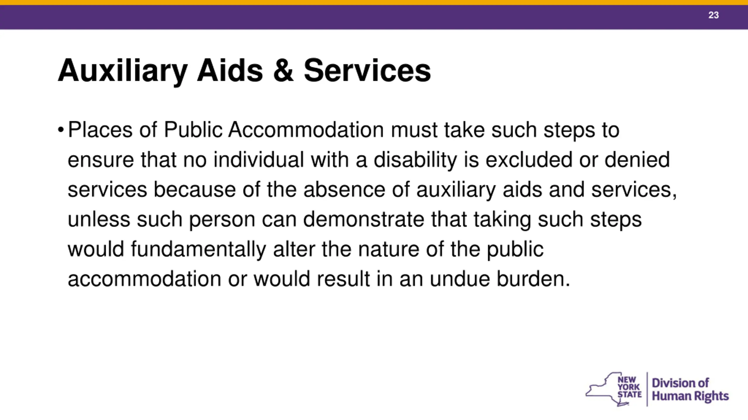 23 Auxiliary Aids & Services Places of Public Accommodation must take such steps to ensure that no individual with a disability is excluded or denied services because of the absence of auxiliary aids and services, unless such person can demonstrate that taking such steps would fundamentally alter the nature of the public accommodation or would result in an undue burden.