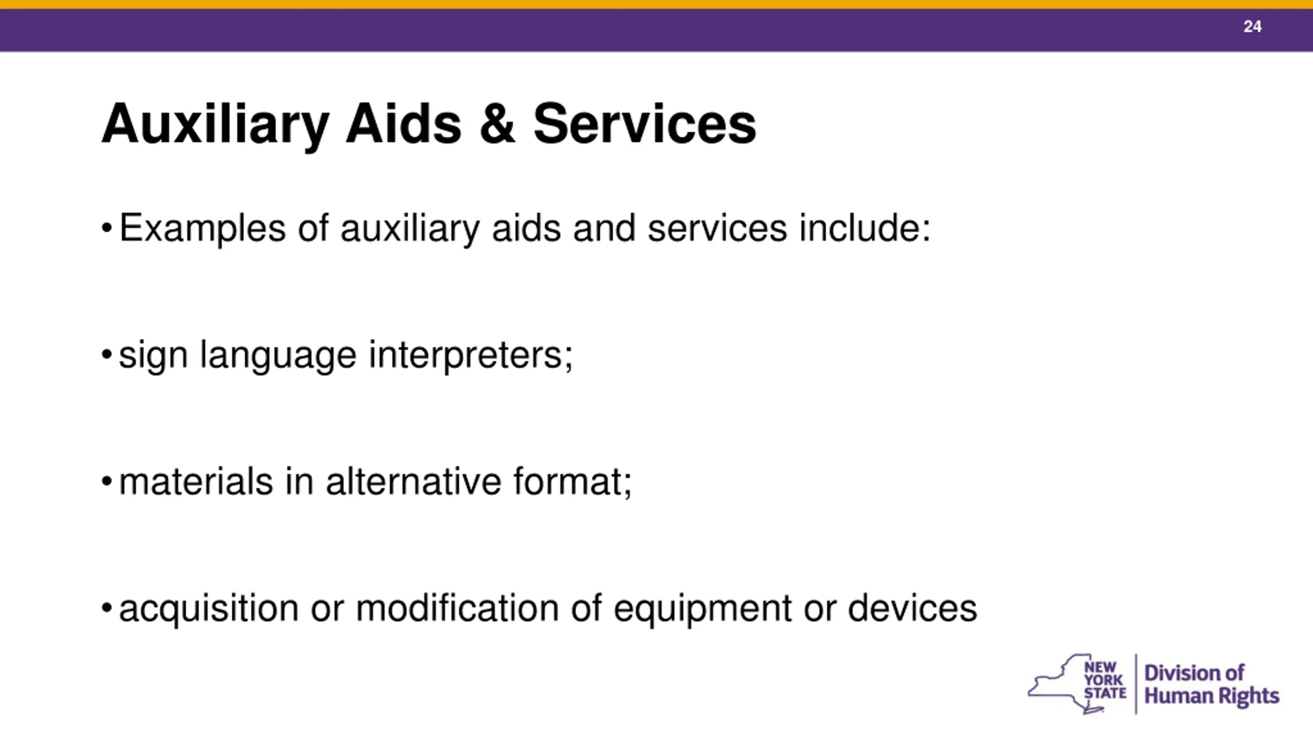 24 Auxiliary Aids & Services Examples of auxiliary aids and services include: sign language interpreters; materials in alternative format; acquisition or modification of equipment or devices