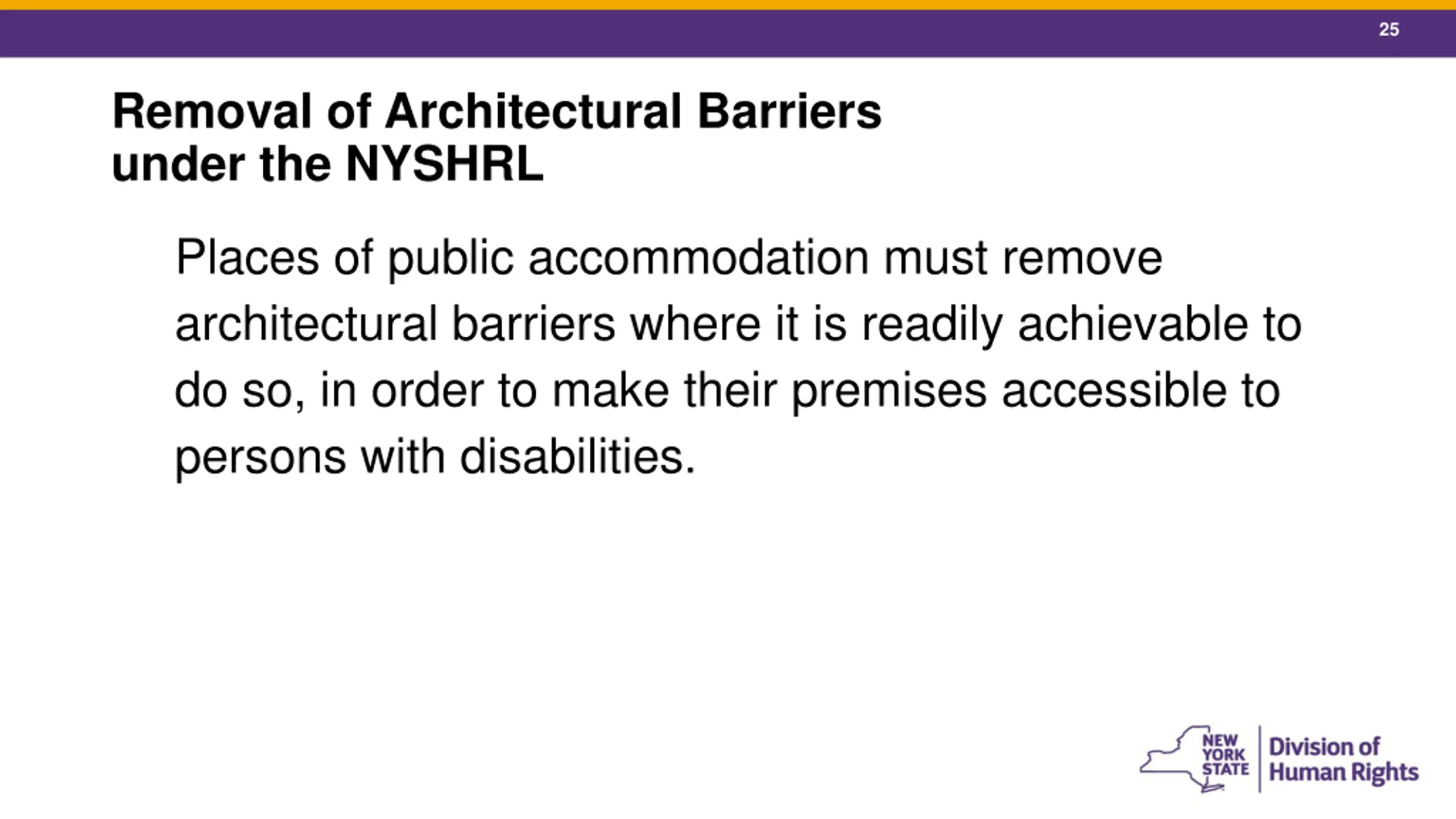 25 Removal of Architectural Barriers under the NYSHRL Places of public accommodation must remove architectural barriers where it is readily achievable to do so, in order to make their premises accessible to persons with disabilities.
