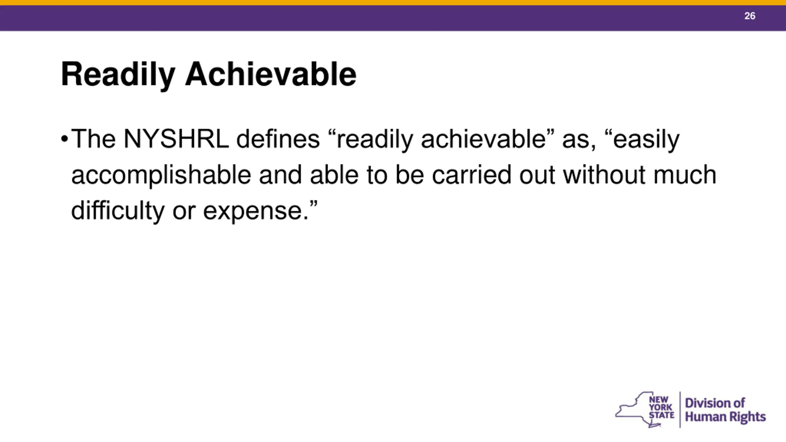 26 Readily Achievable The NYSHRL defines readily achievable as, easily accomplishable and able to be carried out without much difficulty or expense.