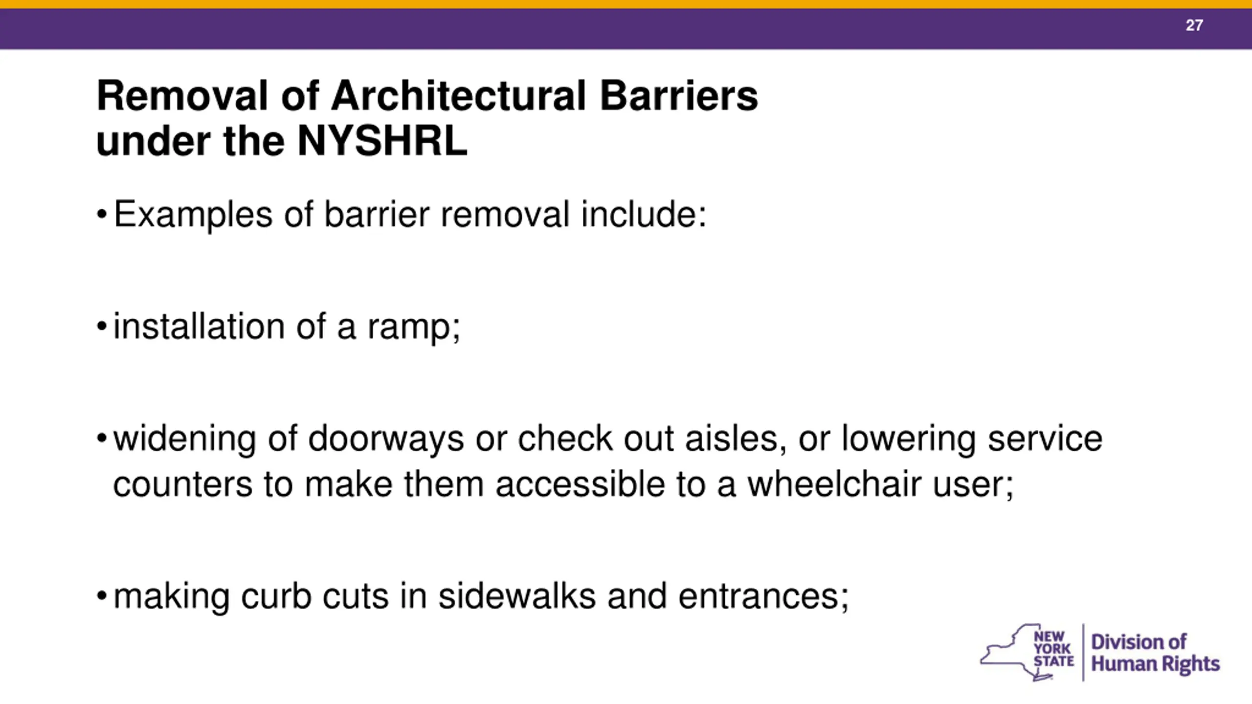 27 Removal of Architectural Barriers under the NYSHRL Examples of barrier removal include: installation of a ramp; widening of doorways or check out aisles, or lowering service counters to make them accessible to a wheelchair user; making curb cuts in sidewalks and entrances;