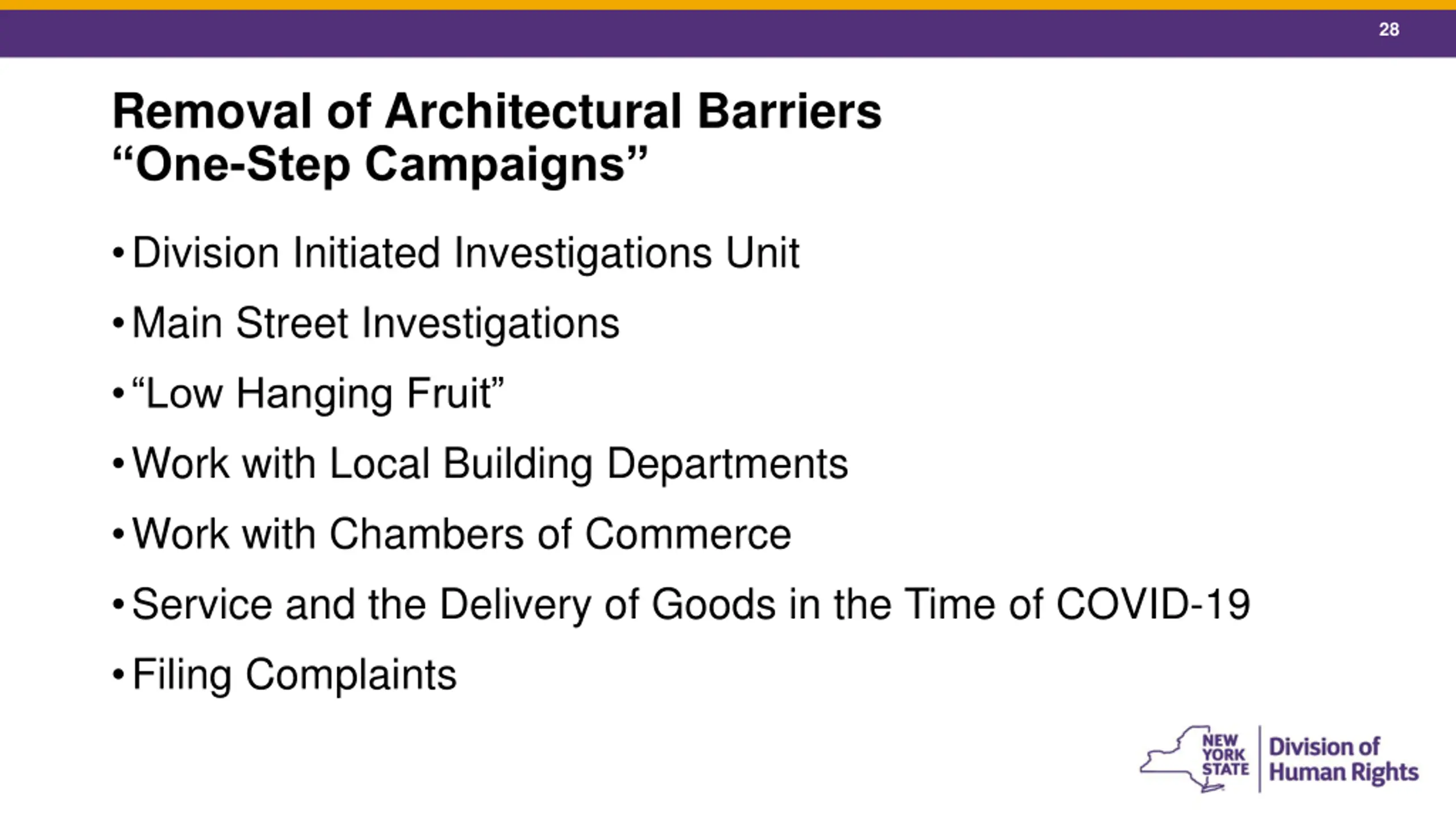 28 Removal of Architectural Barriers One-Step Campaigns Division Initiated Investigations Unit Main Street Investigations Low Hanging Fruit Work with Local Building Departments Work with Chambers of Commerce Service and the Delivery of Goods in the Time of COVID-19 Filing Complaints