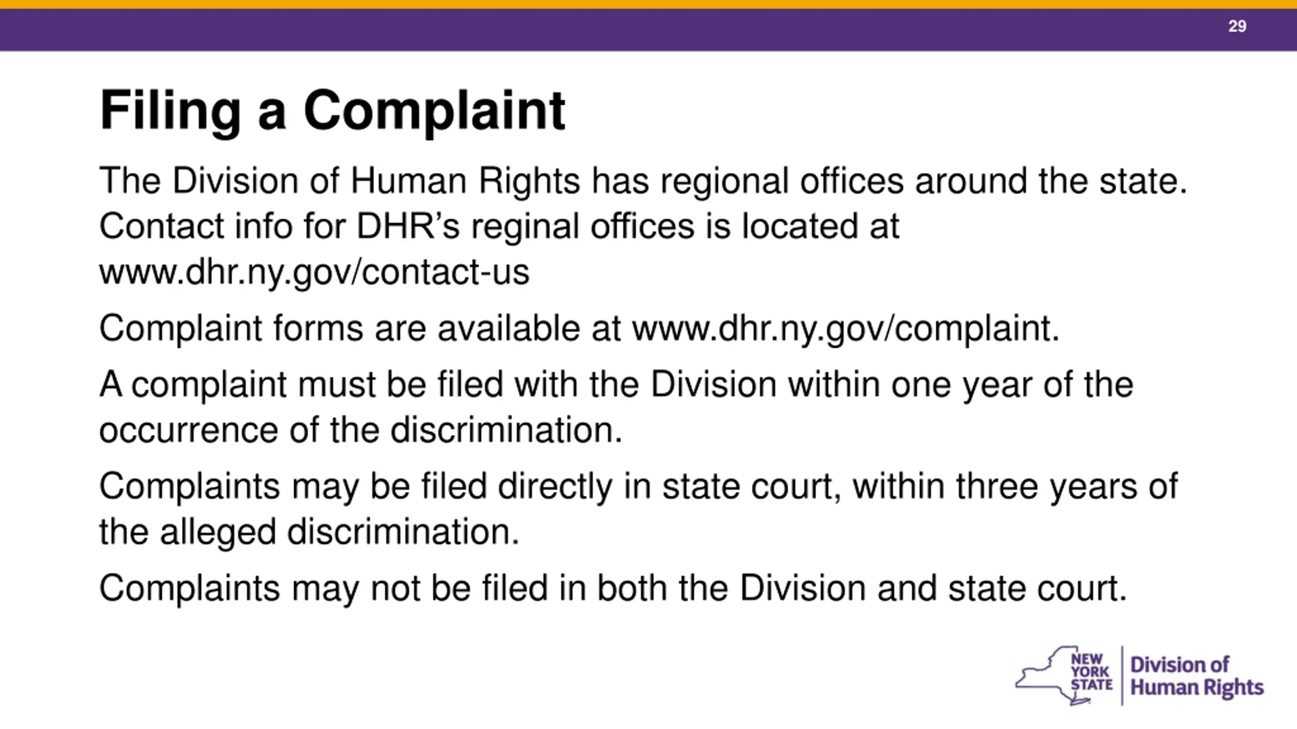 29 Filing a Complaint The Division of Human Rights has regional offices around the state. Contact info for DHR s reginal offices is located at www.dhr.ny.gov/contact-us Complaint forms are available at www.dhr.ny.gov/complaint. A complaint must be filed with the Division within one year of the occurrence of the discrimination. Complaints may be filed directly in state court, within three years of the alleged discrimination. Complaints may not be filed in both the Division and state court.