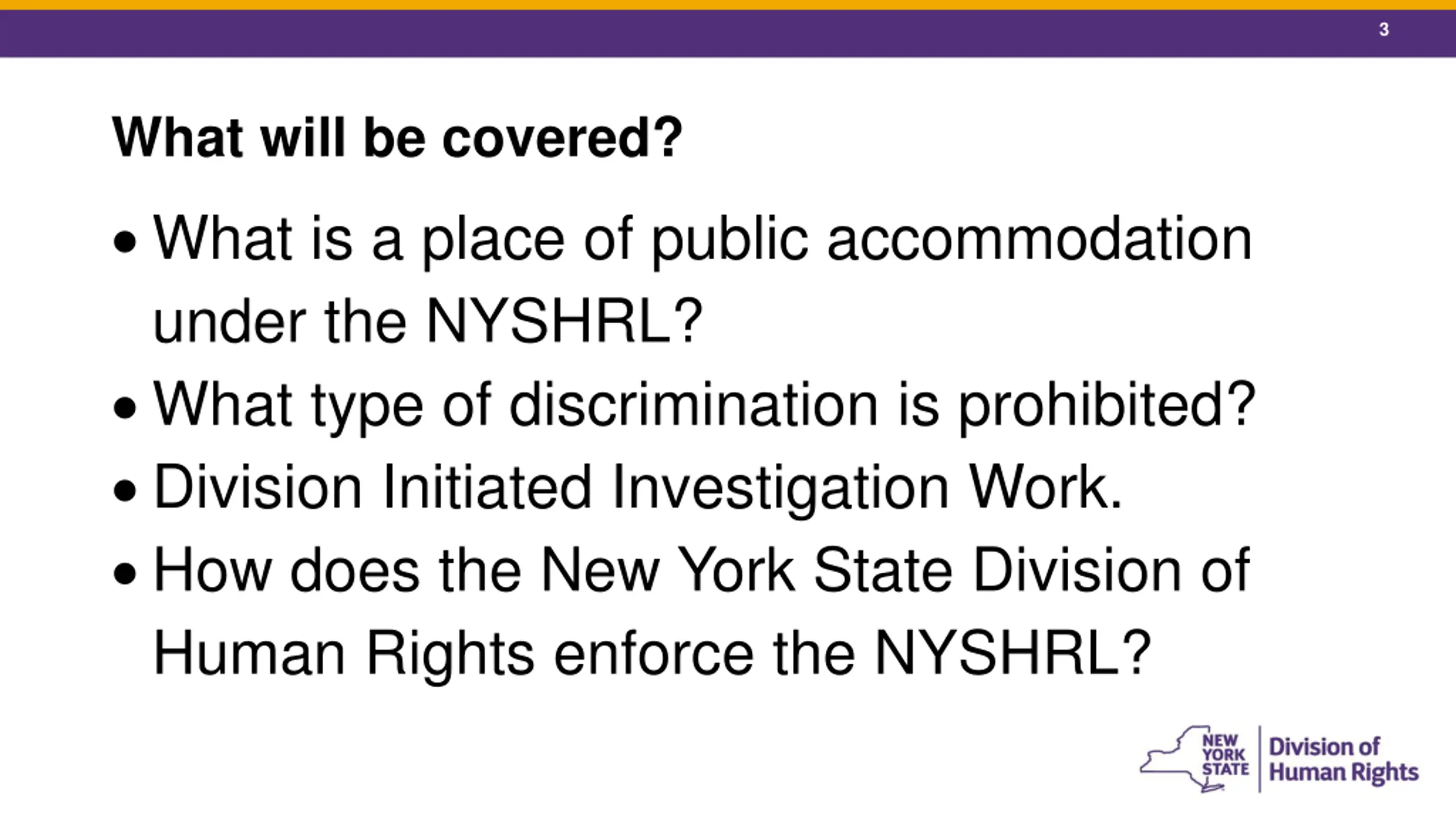 3 What will be covered? What is a place of public accommodation under the NYSHRL? What type of discrimination is prohibited? Division Initiated Investigation Work. How does the New York State Division of Human Rights enforce the NYSHRL?